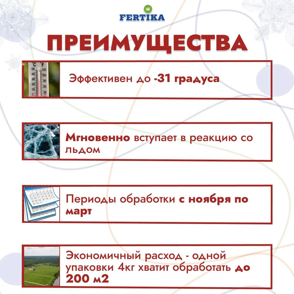 • обладает высокой плавящей способностью, плавит лед в 2-5 раз быстрее, чем другие противоледные реагенты;