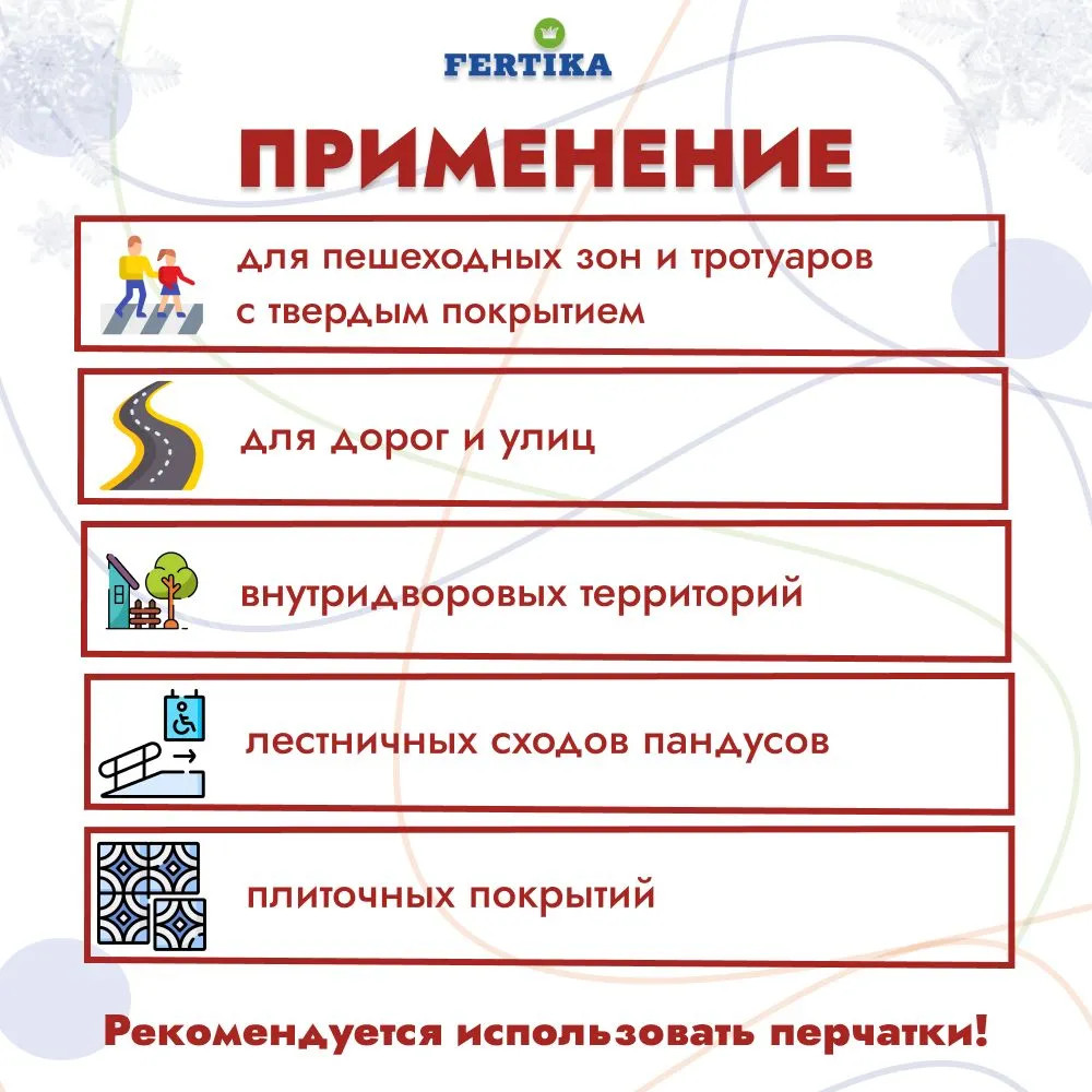 Способы внесения: предварительно очистить поверхность от рыхлого снега. Равномерно рассыпать материал на обрабатываемую поверхность, средний расход материала составляет до 70 г/м2 при толщине льда до 10 мм и температуре до —10°С. Убрать разрушенный лед и снег лопатой, либо щеткой по окончанию процесса плавления льда во избежание повторного образования льда.