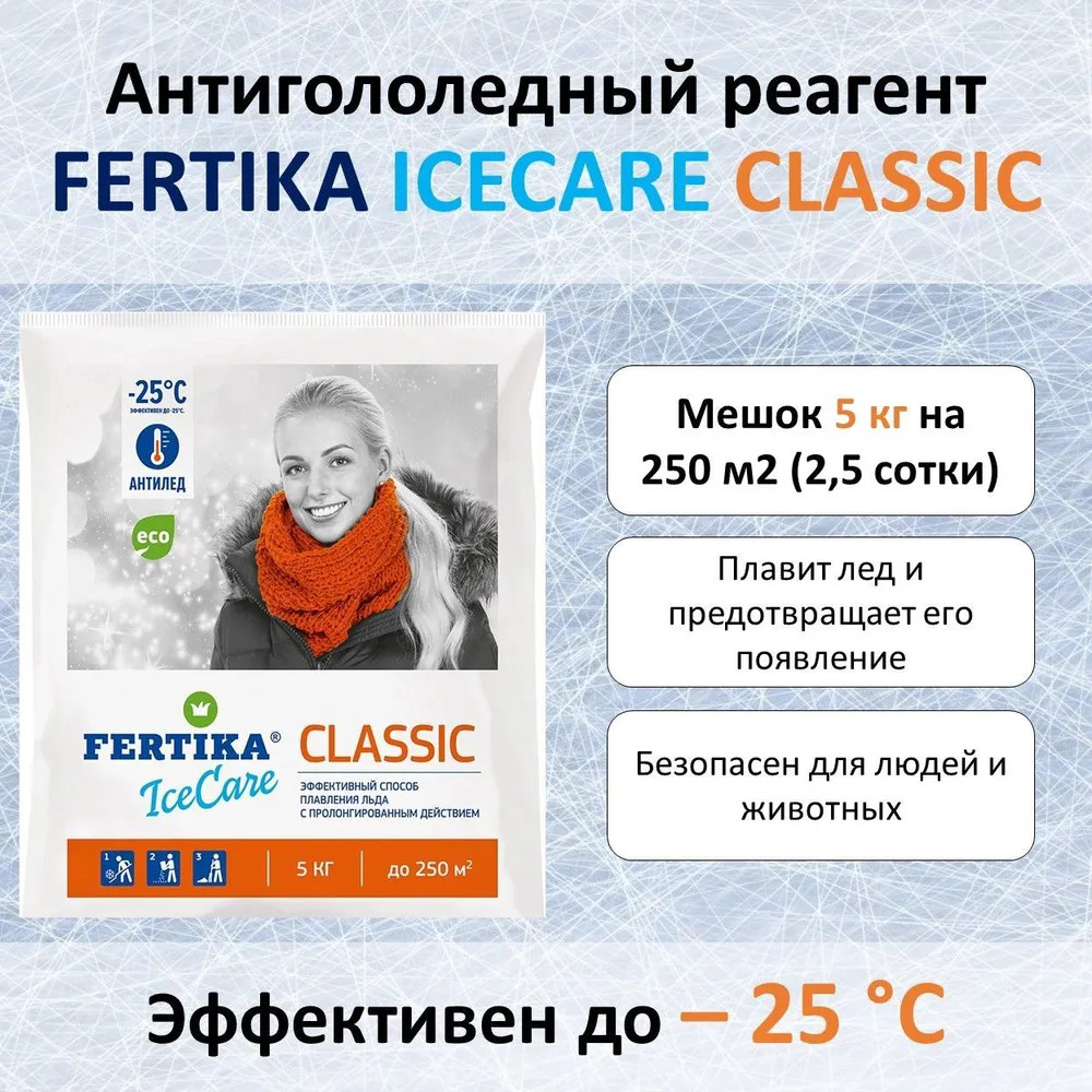 Противогололедный реагент Fertika «IceCare classic» предназначен для длительного предотвращения образования наледи за счет пролонгированного действия. Антилед «IceCare classic» плавит лед в 2-5 раз быстрее, чем другие противоледные реагенты.