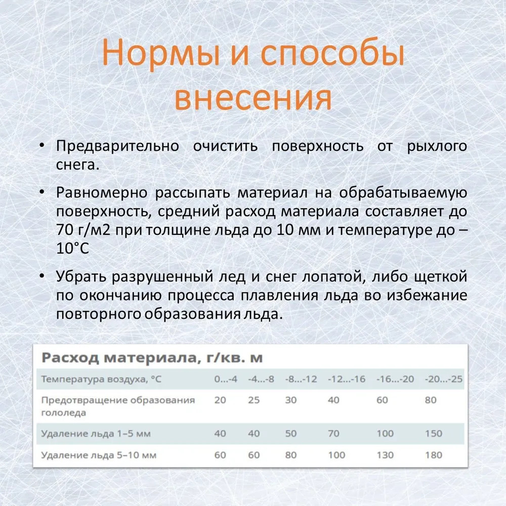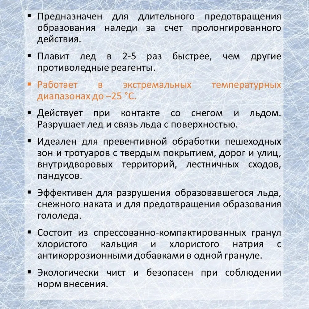 • действует при контакте со снегом и льдом. Разрушает лед и связь льда с поверхностью;