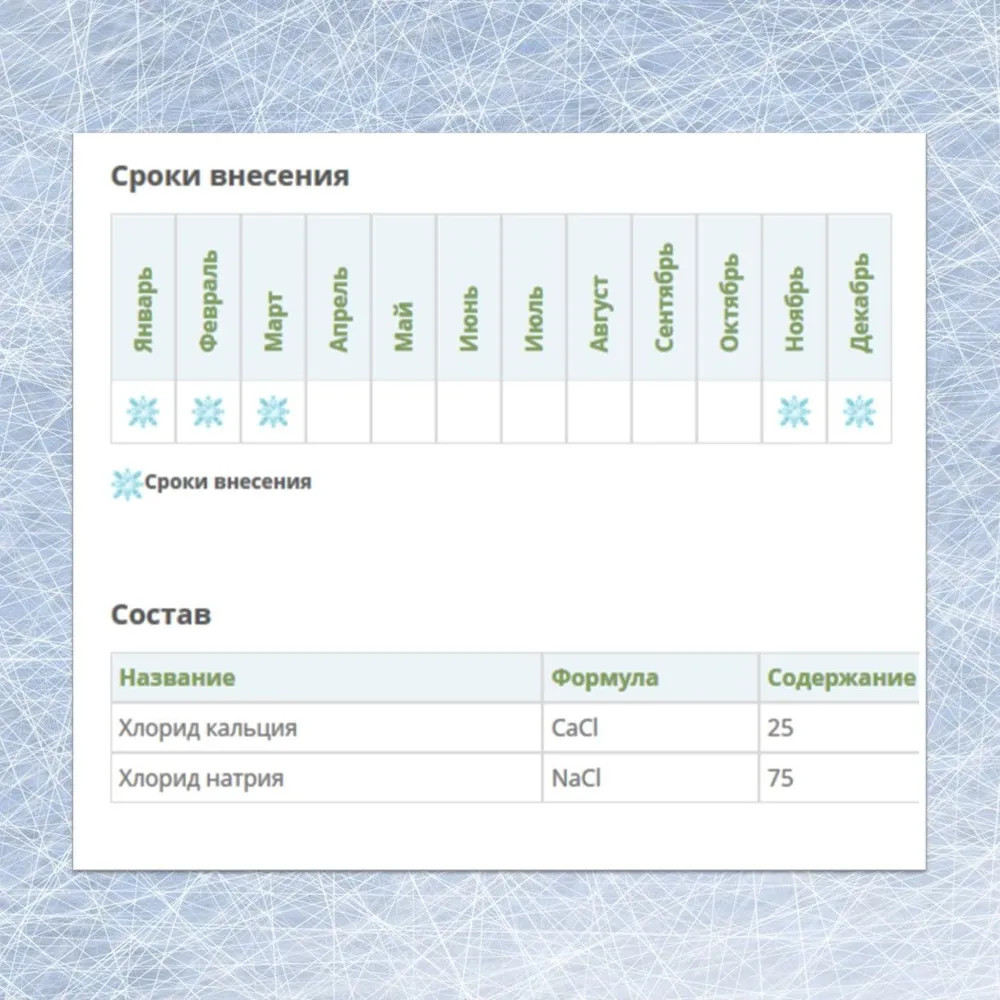 Противогололедное средство состоит из спрессованно-компактированных гранул хлористого кальция и хлористого натрия с антикоррозионными добавками в одной грануле. При работе с веществом рекомендуется использовать перчатки.