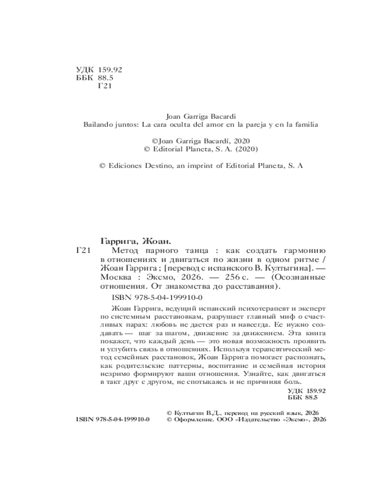 💳 Оплатить за товар можно при получении 🇰🇿 Есть бесплатная доставка по Казахстану от 1 дня 🎁 Копите бонусы с каждой покупки Серия: Осознанные отношения. От знакомства до расставания Жоан Гаррига, ведущий испанский психотерапевт и эксперт по системным расстановкам, разрушает главный миф о счастливых парах: любовь не дается раз и навсегда. Ее нужно создавать — шаг за шагом, движение за движением. Эта книга покажет, что каждый день — это новая возможность проявить и углубить связь в отношениях. Используя терапевтический метод семейных расстановок, Жоан Гаррига помогает распознать, как родительские паттерны, воспитание и семейная история незримо формируют ваши отношения. Узнайте, как двигаться в такт друг с другом, не спотыкаясь и не причиняя боль. |