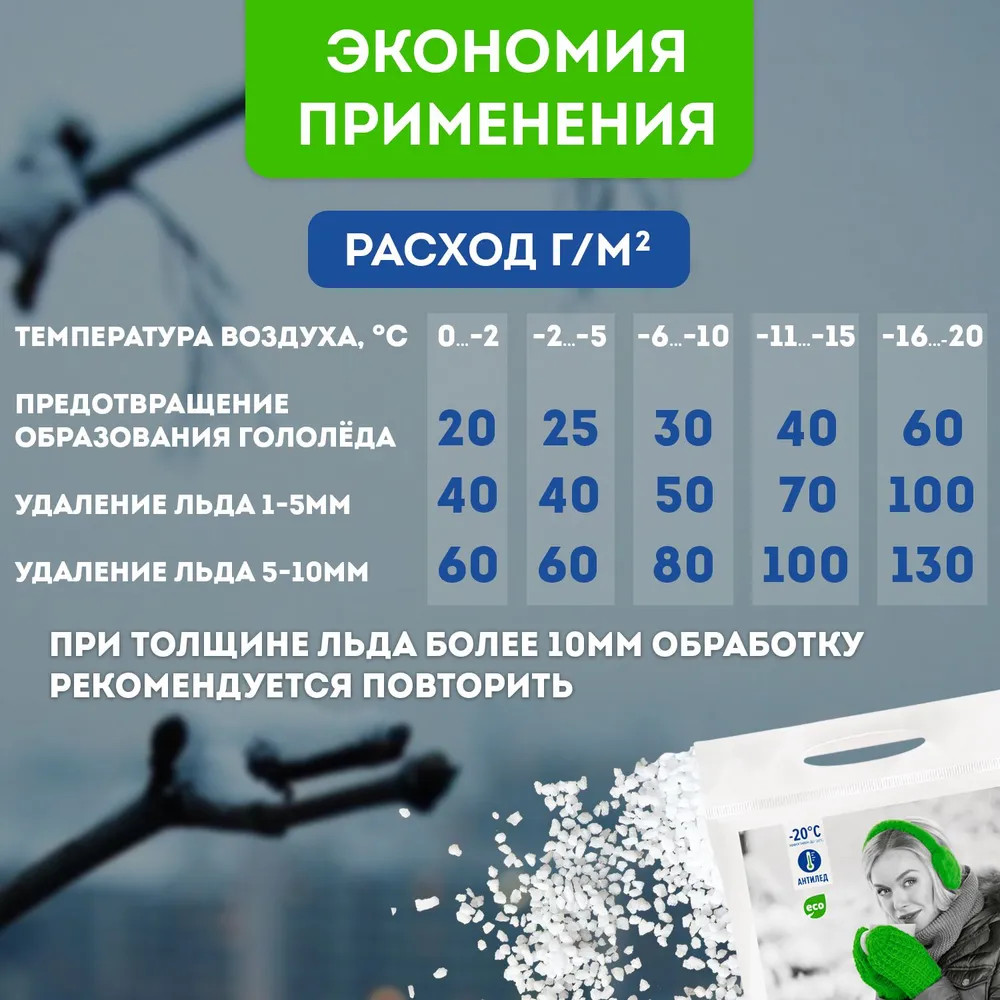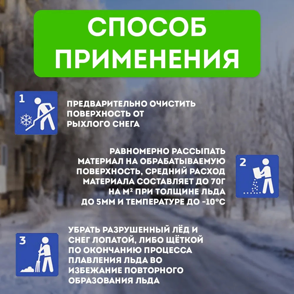 Нормы и способы внесения: предварительно очистить поверхность от рыхлого снега. Равномерно рассыпать материал на обрабатываемую поверхность, средний расход материала составляет до 70 г/м2 при толщине льда до 10 мм и температуре до —10°С. Убрать разрушенный лед и снег лопатой, либо щеткой по окончанию процесса плавления льда во избежание повторного образования льда.