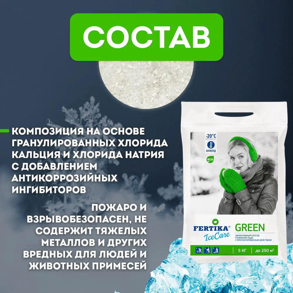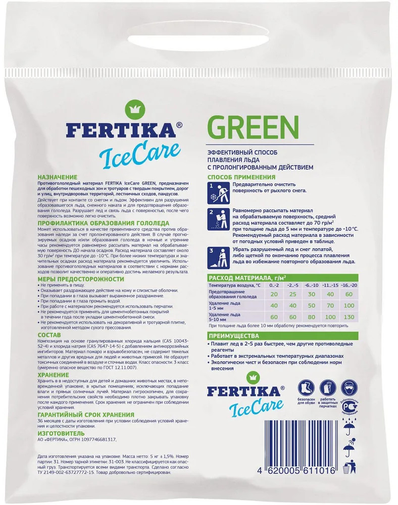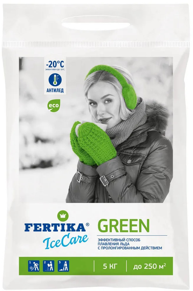 Противогололедный реагент Fertika «IceCare Green» предназначен для длительного предотвращения образования наледи за счет пролонгированного действия. Антилед "«IceCare Green» плавит лед в 2-5 раз быстрее, чем другие противоледные реагенты.