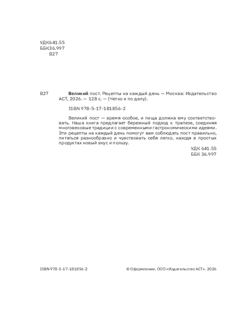 💳 Оплатить за товар можно при получении 🇰🇿 Есть бесплатная доставка по Казахстану от 1 дня 🎁 Копите бонусы с каждой покупки Серия: Четко и по делу Великий пост — время особое, и пища должна ему соответствовать. Наша книга предлагает бережный подход к трапезе, соединяя многовековые традиции с современными гастрономическими идеями. Эти рецепты на каждый день помогут вам соблюдать пост правильно, питаться разнообразно и чувствовать себя легко, находя в простых продуктах новый вкус и пользу. |