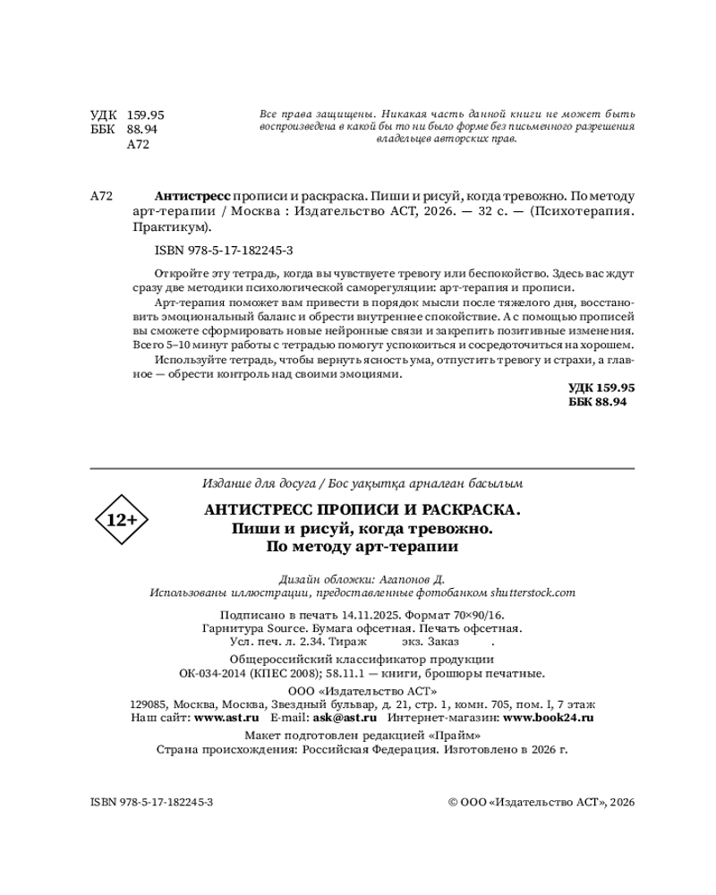💳 Оплатить за товар можно при получении 🇰🇿 Есть бесплатная доставка по Казахстану от 1 дня 🎁 Копите бонусы с каждой покупки Серия: Психотерапия. Практикум Откройте эту тетрадь, когда вам тревожно или вы чувствуете, что устали от беспокойства. Вам на помощь придут сразу две методики психологической саморегуляции — арт-терапия и прописи. Арт-терапия поможет вам привести в порядок мысли после тяжелого дня, восстановить эмоциональный баланс и обрести внутреннее спокойствие. Прописи формируют новые нейронные связи: подсознание впитывает позитивные установки и постепенно начинает менять отношение к жизни. Всего 5–10 минут работы с тетрадью помогают успокоиться и сосредоточиться на позитивных мыслях. Используйте эту тетрадь, чтобы вернуть себе ясность ума, отпустить тревоги и страхи, а главное — обрести контроль над своим эмоциональным состоянием. |