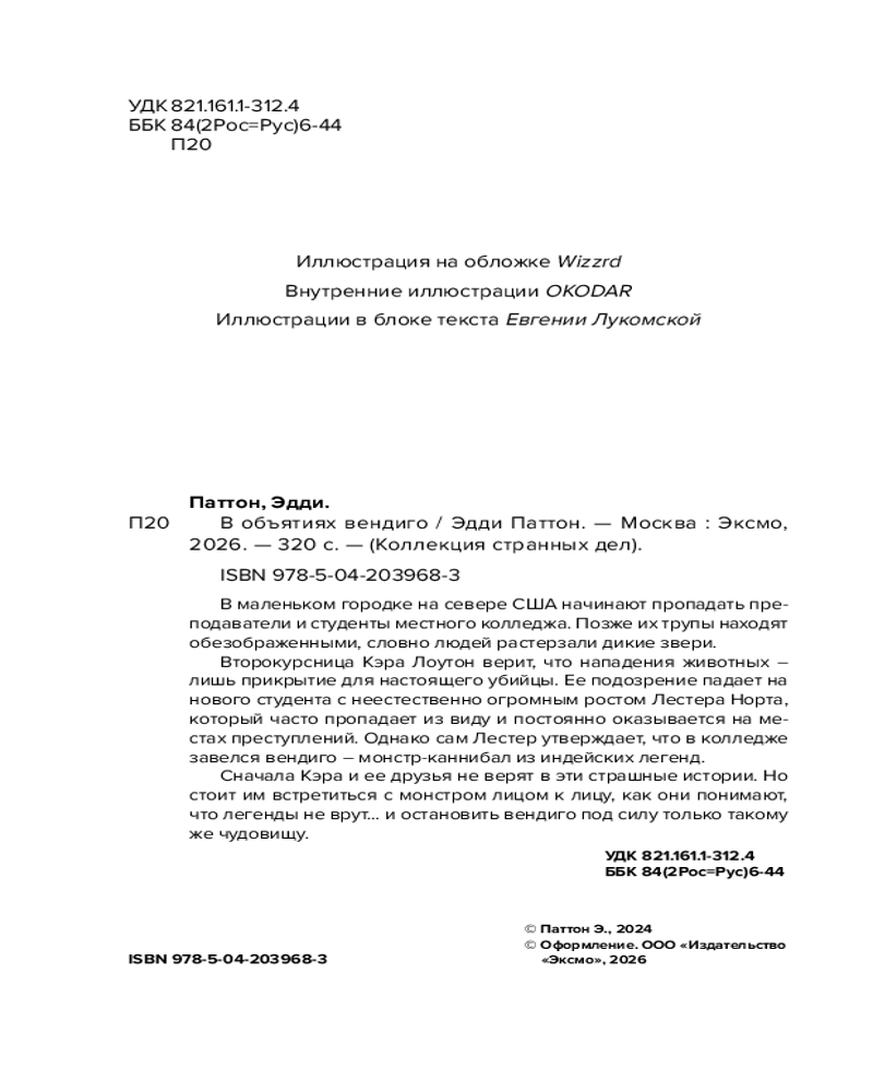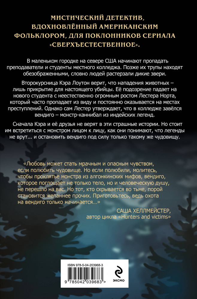 💳 Оплатить за товар можно при получении 🇰🇿 Есть бесплатная доставка по Казахстану от 1 дня 🎁 Копите бонусы с каждой покупки Серия: Коллекция странных дел В маленьком городке на севере США начинают пропадать преподаватели и студенты местного колледжа. Позже их трупы находят обезображенными, словно людей растерзали дикие звери. Второкурсница Кэра Лоутон верит, что нападения животных — лишь прикрытие для настоящего убийцы. Её подозрение падает на нового студента с неестественно огромным ростом — Лестера Норта, который часто пропадает из виду и постоянно оказывается на местах преступлений. Однако сам Лестер утверждает, что в колледже завёлся вендиго — монстр-каннибал из индейских легенд. Сначала Кэра и её друзья не верят в эти страшные истории. Но стоит им встретиться с монстром лицом к лицу, как они понимают, что легенды не врут... И остановить вендиго под силу только такому же чудовищу. |