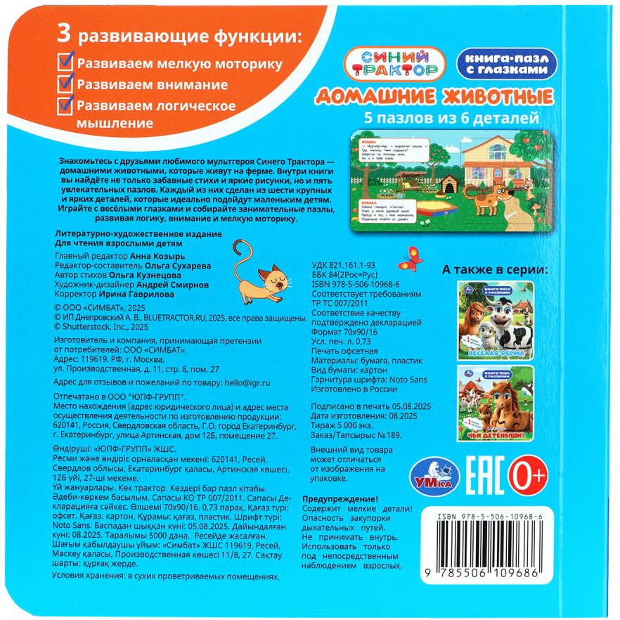 💳 Оплатить за товар можно при получении 🇰🇿 Есть бесплатная доставка по Казахстану от 1 дня 🎁 Копите бонусы с каждой покупки Серия: Синий трактор Книга-пазл с глазками «Синий Трактор. Домашние животные» ТМ «УМка» станет прекрасным подарком для ребёнка. Данная книга выполняет сразу 2 функции: это и книга для чтения, и игра в пазлы. На каждом развороте малыша ждёт интересный стих про обитателя фермы, а также яркий пазл с его изображением. Крупные пазлы, добрые стихотворения и забавные глазки, благодаря которым персонаж на обложке выглядит совсем как живой, не оставят равнодушным маленького читателя и подарят ему много весёлых и увлекательных минут игры с этой книгой. Книжка изготовлена из плотного картона, поэтому мамы могут не опасаться, что ребёнок порвёт странички. Благодаря удобному формату книгу можно взять с собой в дорогу. |