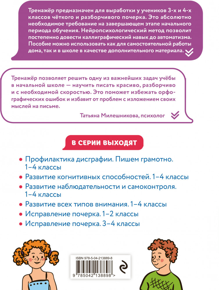 💳 Оплатить за товар можно при получении 🇰🇿 Есть бесплатная доставка по Казахстану от 1 дня 🎁 Копите бонусы с каждой покупки Серия: Нейротетрадь ученика начальной школы Нейротетрадь по исправлению почерка предназначена для учеников 3 и 4 классов. Верное написание букв и правильное их соединение приводит к уменьшению количества ошибок на письме. Чистописание способствует развитию устной речи, памяти и интеллекта, потому что при письме активизируются соответствующие области мозга. Помимо этого, красивый и чёткий почерк улучшает внимание, мелкую моторику, координацию движений и глазомер. Уникальные задания по каллиграфии позволят ученикам начальной школы не только значительно улучшить почерк, но и повысить скорость письма, что очень важно в учебном процессе. |