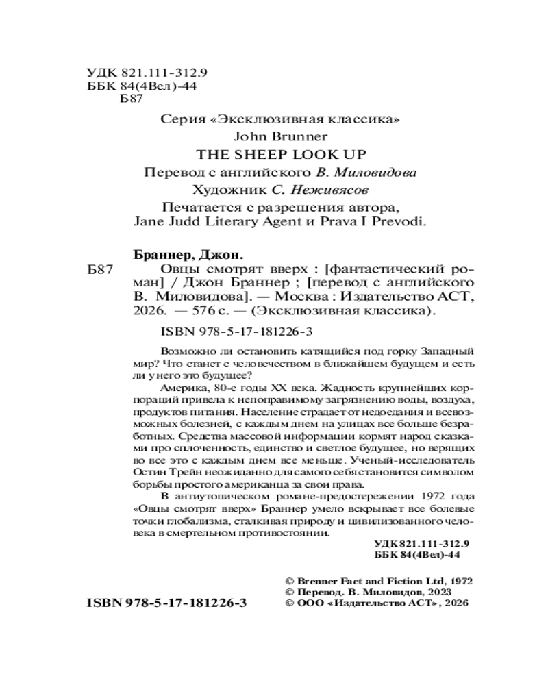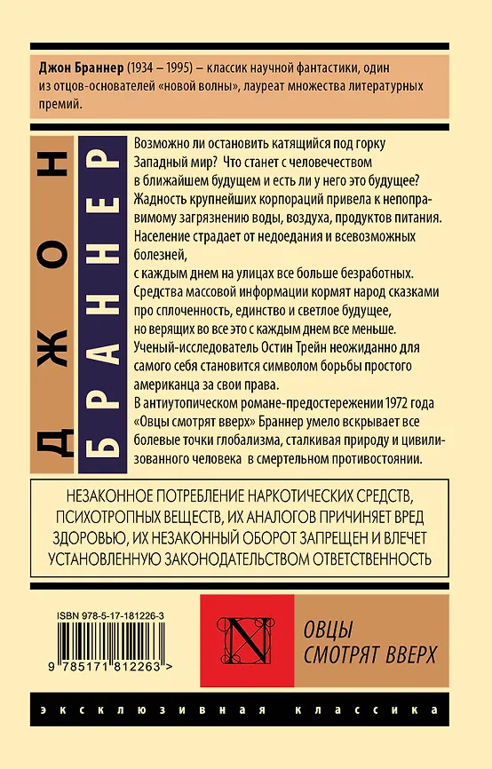 💳 Оплатить за товар можно при получении 🇰🇿 Есть бесплатная доставка по Казахстану от 1 дня 🎁 Копите бонусы с каждой покупки Серия: Эксклюзивная классика Возможно ли остановить катящийся под горку Западный мир? Что станет с человечеством в ближайшем будущем, и есть ли у него это будущее? Америка, 80-е годы ХХ века. Жадность крупнейших корпораций привела к непоправимому загрязнению воды, воздуха, продуктов питания. Население страдает от недоедания и всевозможных болезней, с каждым днем на улицах все больше безработных. Средства массовой информации кормят народ сказками про сплоченность, единство и светлое будущее, но верящих во все это с каждым днем все меньше. Ученый-исследователь Остин Трейн неожиданно для самого себя становится символом борьбы простого американца за свои права. В антиутопическом романе-предостережении 1972 года «Овцы смотрят вверх» Браннер умело вскрывает все болевые точки глобализма, сталкивая природу и цивилизованного человека в смертельном противостоянии. |