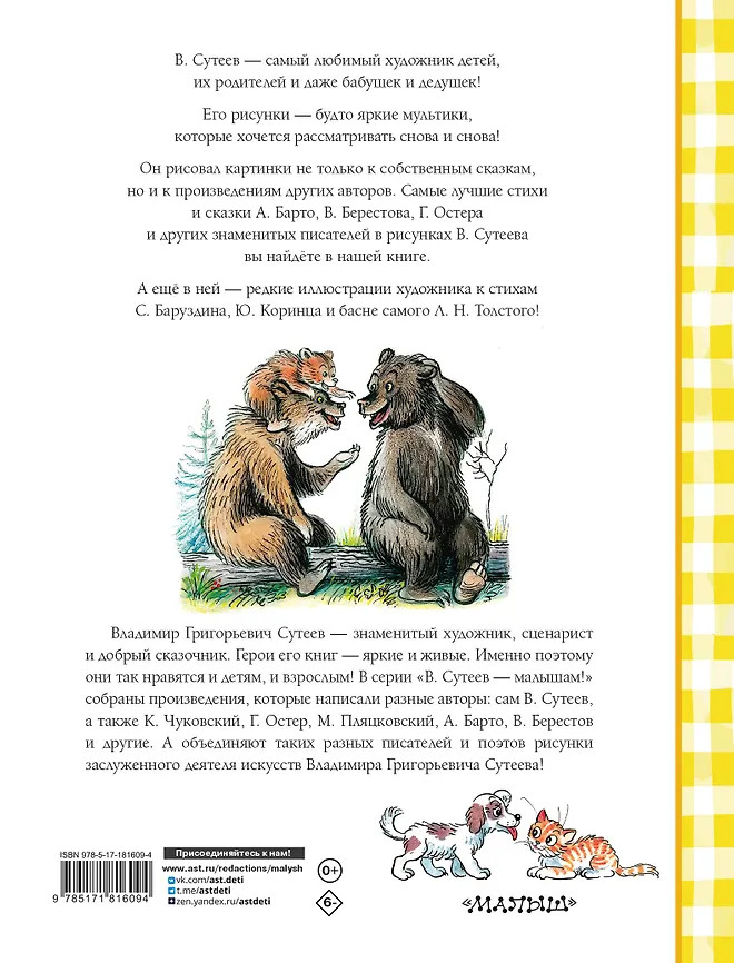 💳 Оплатить за товар можно при получении 🇰🇿 Есть бесплатная доставка по Казахстану от 1 дня 🎁 Копите бонусы с каждой покупки Серия: В. Сутеев — малышам! В сборник вошли самые лучшие стихи и сказки классиков детской литературы — А. Барто, В. Берестова, Г. Остера и других в рисунках В. Сутеева. Прочитав книгу, дети узнают, почему аист опоздал на ёлку, где у сосиски середина, как стать самым лучшим братом на свете и много-много других интересных историй. В конце сборника их ждут задания от самого художника. |