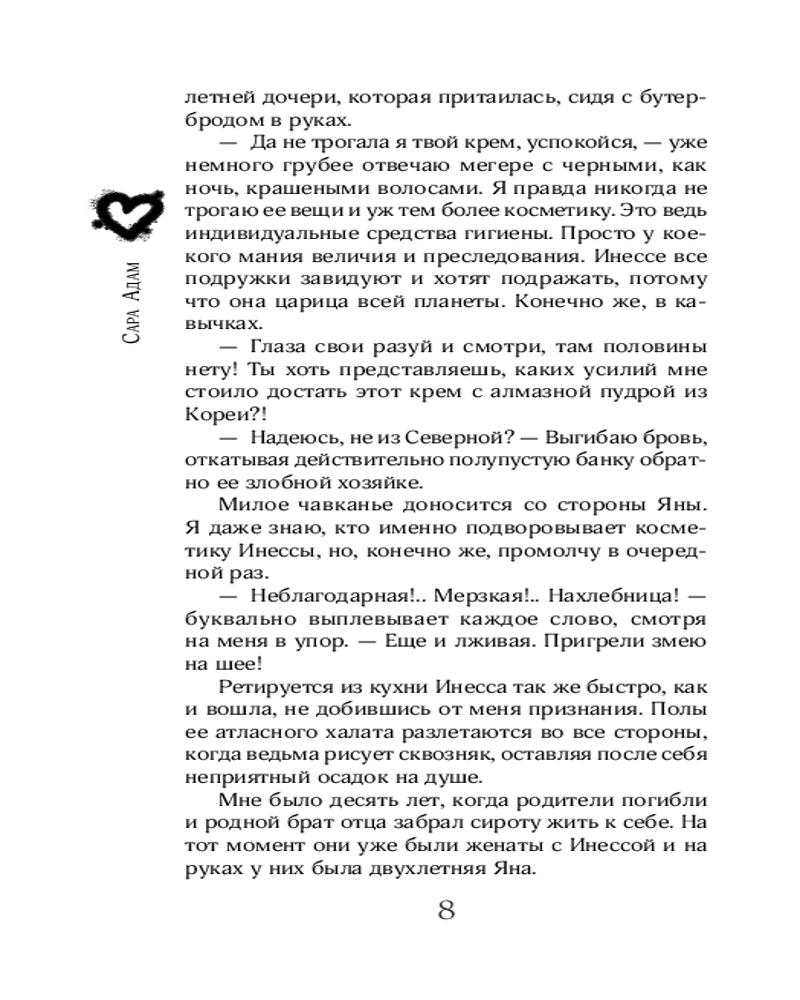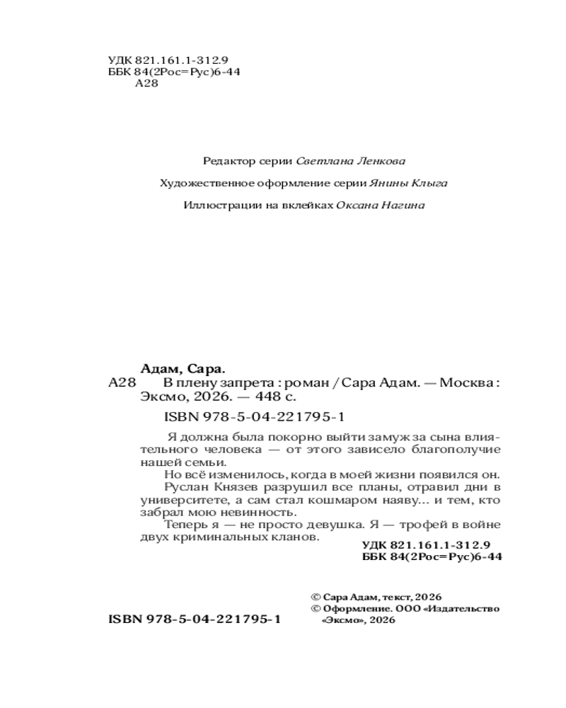 💳 Оплатить за товар можно при получении 🇰🇿 Есть бесплатная доставка по Казахстану от 1 дня 🎁 Копите бонусы с каждой покупки Серия: Вне законов любви. Темная романтика Я должна была покорно выйти замуж за сына влиятельного человека — от этого зависело благополучие нашей семьи. Но всё изменилось, когда в моей жизни появился он. Руслан Князев разрушил все планы, отравил дни в университете, а сам стал кошмаром наяву... и тем, кто забрал мою невинность. Теперь я — не просто девушка. Я — трофей в войне двух криминальных кланов. |