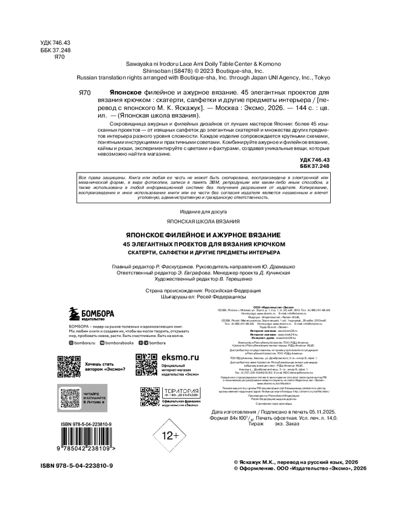 💳 Оплатить за товар можно при получении 🇰🇿 Есть бесплатная доставка по Казахстану от 1 дня 🎁 Копите бонусы с каждой покупки Серия: Японская школа вязания Откройте для себя изысканное искусство ажурного и филейного вязания крючком! Вас ждет 45 уникальных дизайнов от лучших японских мастеров, сочетающие традиционную гармонию и современные идеи: от лёгких ажурных салфеток до изящных декоративных скатертей, подставок и оригинальных аксессуаров для дома. Каждая схема выполнена в крупном формате, а инструкции даны максимально понятно и подробно, чтобы вязать было легко даже новичкам. Используйте мотивы по отдельности, комбинируйте филейные дизайны с ажурными, играйте с цветом и фактурой — и создавайте уникальные изделия, которые невозможно найти в магазине. Каждая работа будет отражением вашего вкуса и таланта. |
