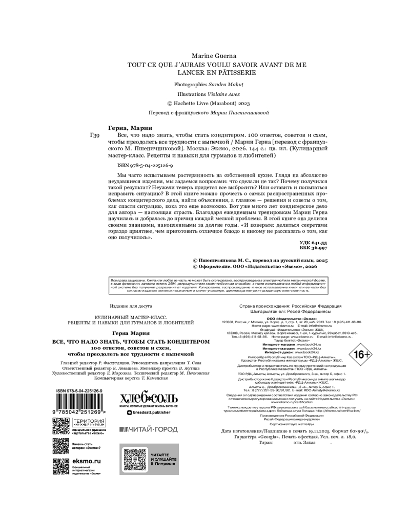 💳 Оплатить за товар можно при получении 🇰🇿 Есть бесплатная доставка по Казахстану от 1 дня 🎁 Копите бонусы с каждой покупки Серия: Кулинарный мастер-класс. Рецепты и навыки для гурманов и любителей Почему мой крем слишком жидкий? Почему шоколадная крошка оседает на дно торта? Почему заварные булочки расплющены? Почему глазурь прозрачная? Столько вопросов об этих приготовленных блюдах, которые выглядят не очень аппетитно... Марин Герна делится своими техниками и советами, которые помогут вам распознать ошибки, исправить их и, самое главное, добиться успеха в следующий раз. |