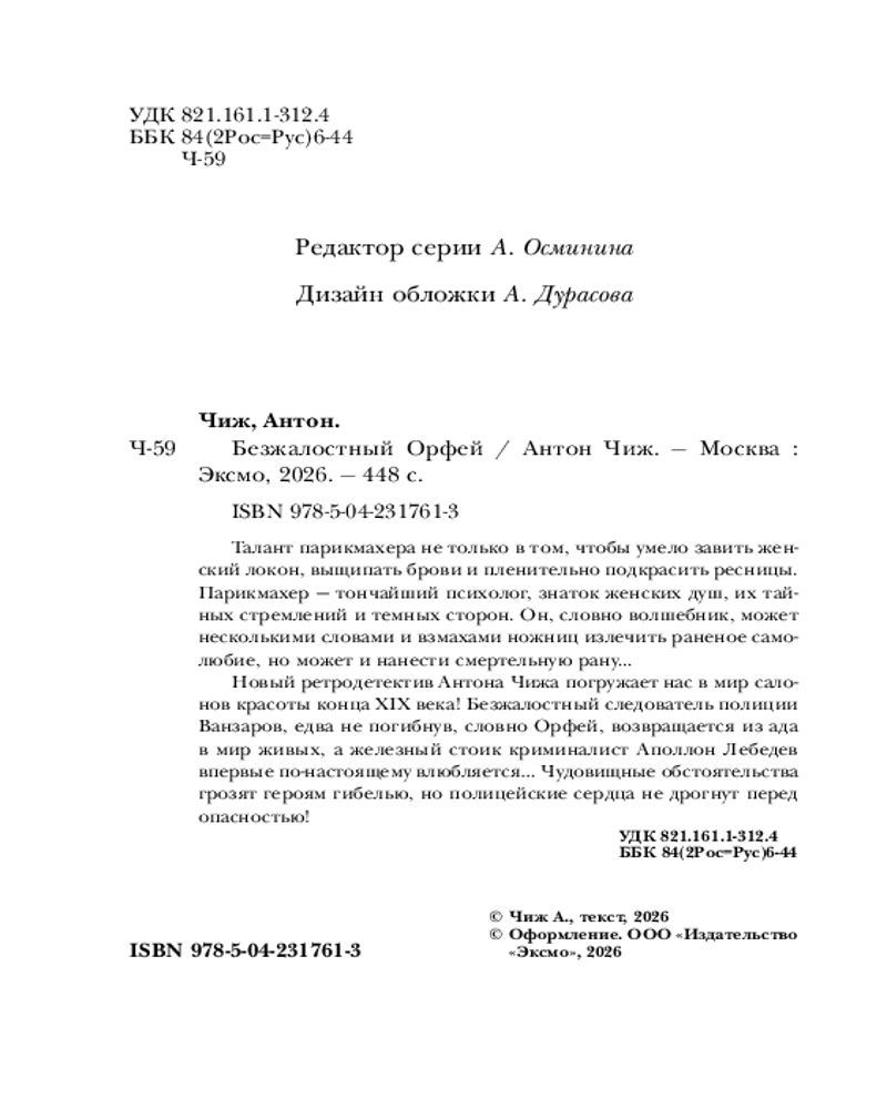 💳 Оплатить за товар можно при получении 🇰🇿 Есть бесплатная доставка по Казахстану от 1 дня 🎁 Копите бонусы с каждой покупки Серия: Исторические детективы Антона Чижа. Цикл «Ванзаров» Талант парикмахера не только в том, чтобы умело завить женский локон, выщипать брови и пленительно подкрасить ресницы. Парикмахер — тончайший психолог, знаток женских душ, их тайных стремлений и темных сторон. Он, словно волшебник, может несколькими словами и взмахами ножниц излечить раненное самолюбие, но может и нанести смертельную рану... |
