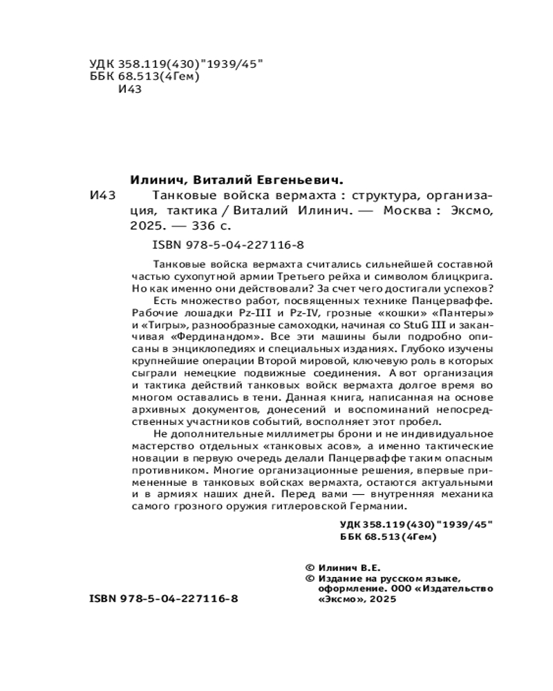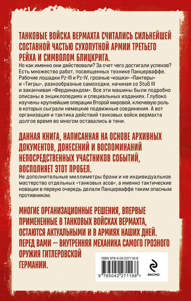 💳 Оплатить за товар можно при получении 🇰🇿 Есть бесплатная доставка по Казахстану от 1 дня 🎁 Копите бонусы с каждой покупки Серия: Военное дело Танковые войска вермахта считались сильнейшей составной частью сухопутной армии Третьего рейха и символом блицкрига. Но как именно они действовали? За счет чего достигали успехов? Есть множество работ, посвященных технике Панцерваффе. Рабочие лошадки Pz-III и Pz-IV, грозные «кошки» «Пантера» и «Тигр», разнообразные самоходки, начиная со StuG III и заканчивая «Фердинандом». Все эти машины были подробно описаны в энциклопедиях и специальных изданиях. Глубоко изучены крупнейшие операции Второй мировой, ключевую роль в которых сыграли немецкие подвижные соединения. А вот организация и тактика действий танковых войск вермахта долгое время во многом оставались в тени. Данная книга, написанная на основе архивных документов, донесений и воспоминаний непосредственных участников событий, восполняет этот пробел. |