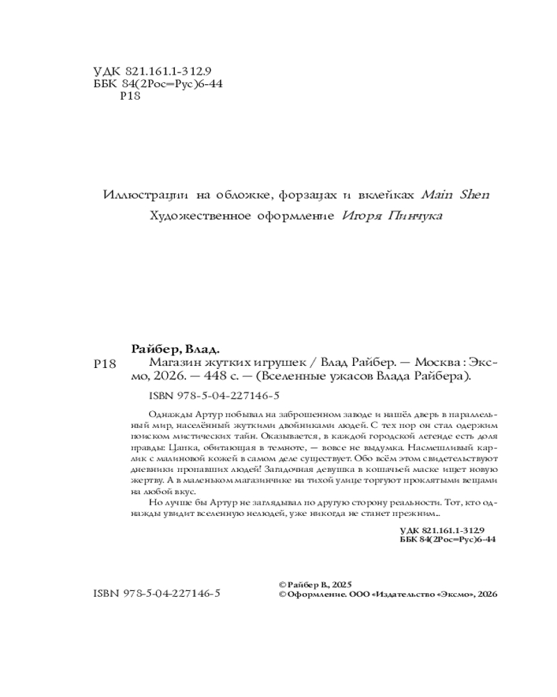 💳 Оплатить за товар можно при получении 🇰🇿 Есть бесплатная доставка по Казахстану от 1 дня 🎁 Копите бонусы с каждой покупки Серия: Вселенные ужасов Влада Райбера Однажды Артур побывал на заброшенном заводе и нашёл дверь в параллельный мир, населённый жуткими двойниками людей. С тех пор он стал одержим поиском мистических тайн. Оказывается, в каждой городской легенде есть доля правды: Цапка, обитающая в темноте, — вовсе не выдумка. Насмешливый карлик с малиновой кожей в самом деле существует. Обо всём этом свидетельствуют дневники пропавших людей! Загадочная девушка в кошачьей маске ищет новую жертву. А в маленьком магазинчике на тихой улице торгуют проклятыми вещами на любой вкус. Но лучше бы Артур не заглядывал по другую сторону реальности. Тот, кто однажды увидит вселенную нелюдей, уже никогда не станет прежним... |