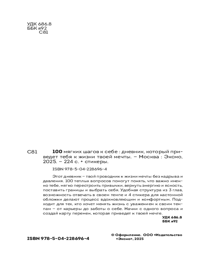 Удобная структура — 3 главы с вопросами в каждой, чтобы двигаться порциями, видеть прогресс и не терять мотивацию. Мягкий формат работы — можешь писать, рисовать, составлять списки, отвечать не по порядку, возвращаться к любимым вопросам. 4 стикера в комплекте — чтобы создать кастомную обложку, отражающую именно твое настроение и состояние. Подойдет тем, кто ищет способ менять жизнь без давления, с уважением к своим темпам — будь то смена работы, улучшение отношений, забота о здоровье или просто желание жить осмысленнее. Пусть это будет твой год смелых, но бережных открытий! Начни с одного вопроса сегодня — и через 100 шагов удивишься, как изменилось всё вокруг. |