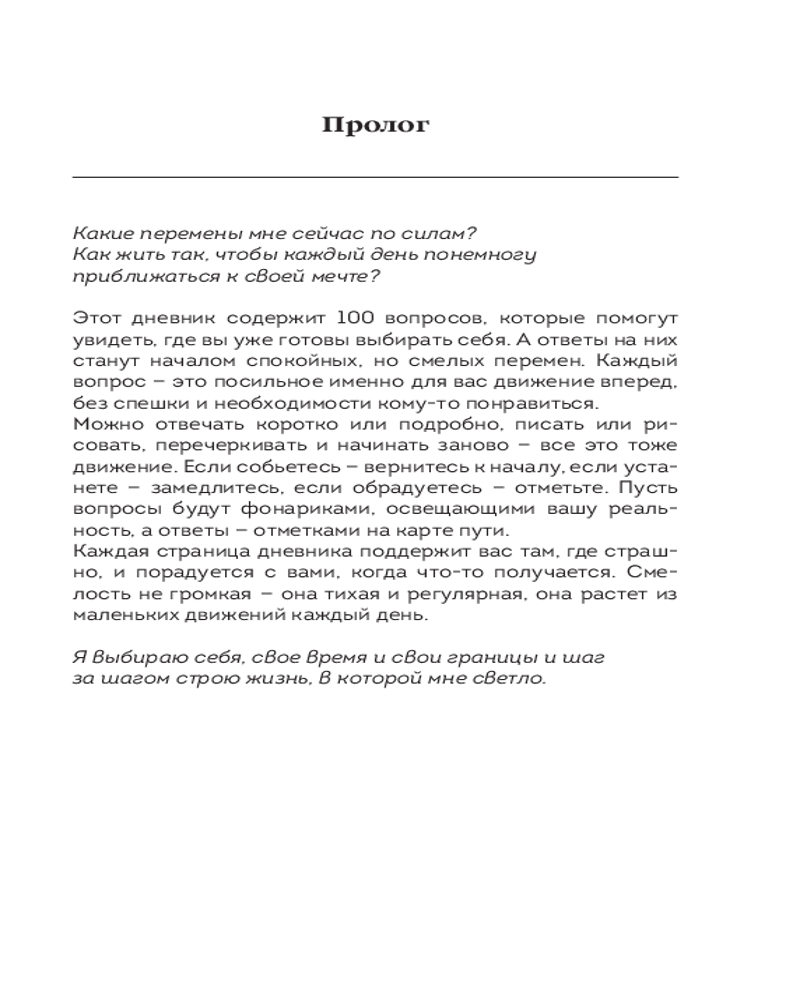 Этот дневник — твой личный проводник в мир осознанных, но простых изменений. Здесь собрано 100 теплых и мотивирующих вопросов, которые помогут: