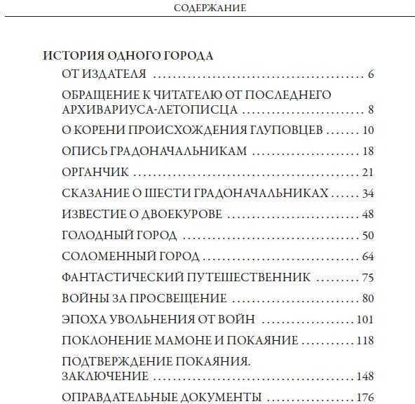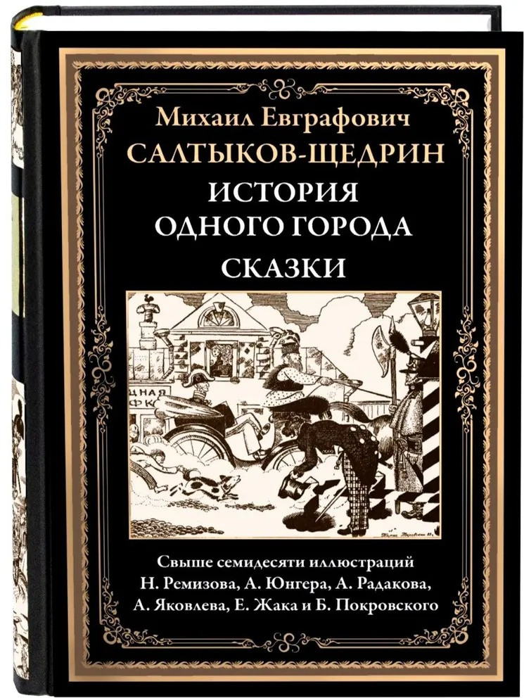 Знаменитый сатирический роман-хроника «История одного города» М. Е. Салтыкова-Щедрина в этом издании проиллюстрирован портретами глуповских градоначальников, выполненных Николаем Ремизовым, Александром Юнгером, Алексеем Радаковым и Александром Яковлевым; впервые эти блестящие рисунки были опубликованы в 1907 г. отдельным альбомом. Издание включает также девятнадцать сказок Салтыкова-Щедрина, в том числе такие известные как «Премудрый пескарь» и «Карась-идеалист». Рисунки к сказкам выполнены Евгением Жаком и Борисом Покровским.