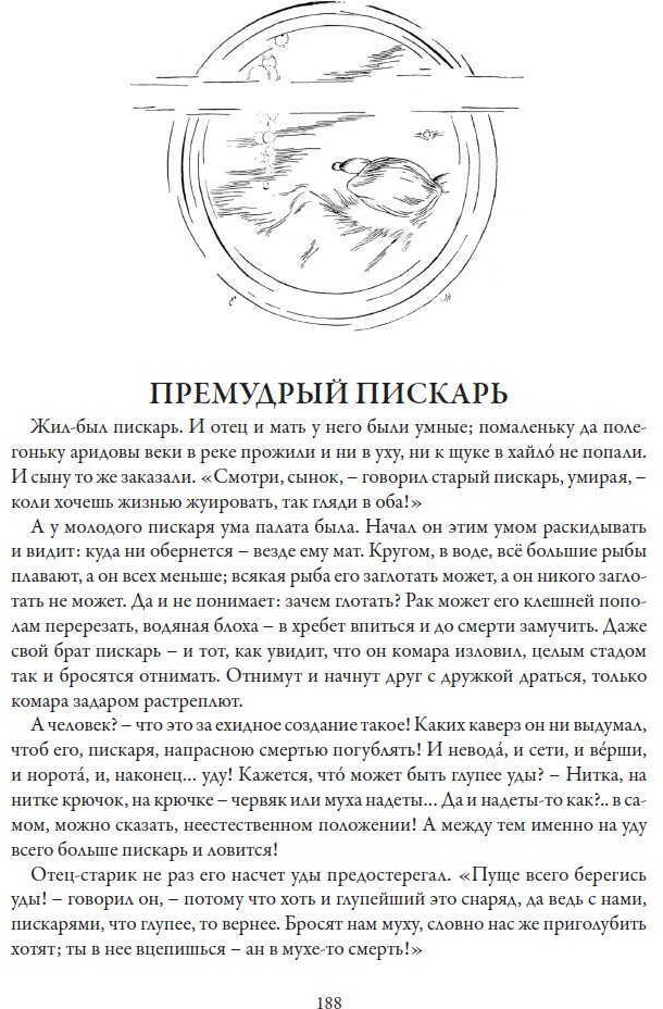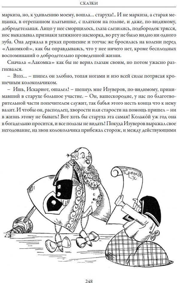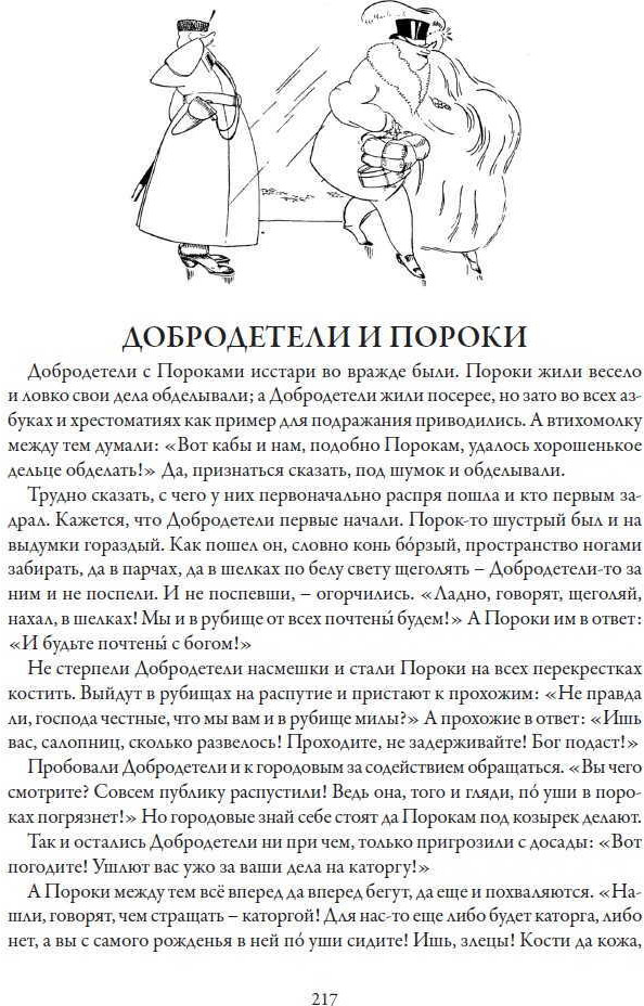 «История одного города» в этом издании проиллюстрирован портретами глуповских градоначальников, выполненных Н. Ремизовым, А. Юнгером, А. Радаковым и А. Яковлевым. Впервые эти блестящие рисунки были опубликованы в 1907 г. отдельным альбомом. Рисунки к сказкам сборника выполнены Е. Жаком и Б. Покровским. |