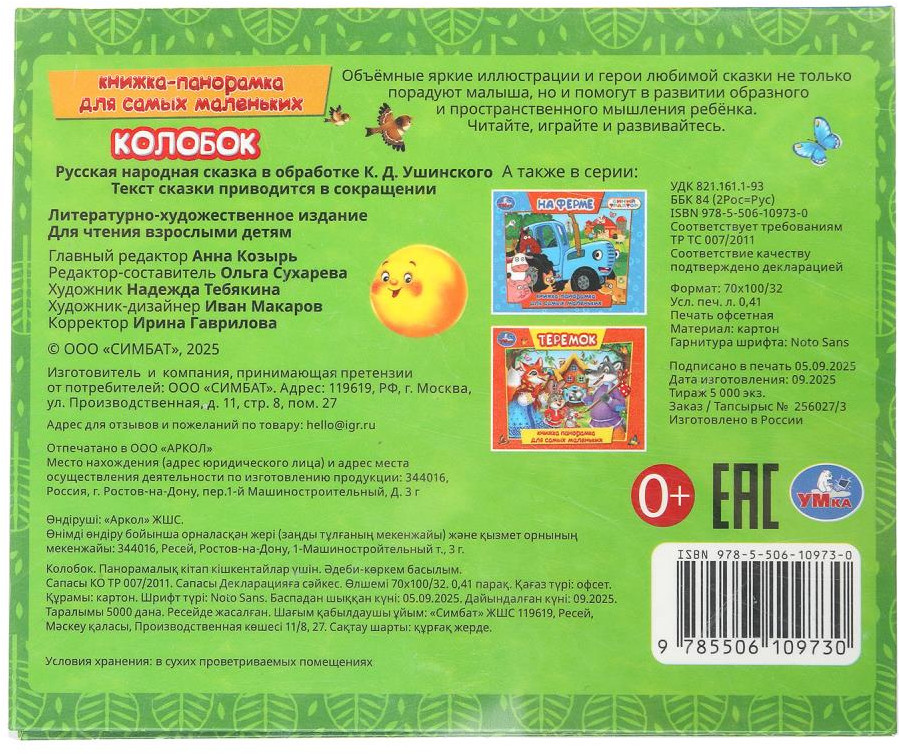 💳 Оплатить за товар можно при получении 🇰🇿 Есть бесплатная доставка по Казахстану от 1 дня 🎁 Копите бонусы с каждой покупки Книжка-панорамка для самых маленьких «Колобок» ТМ «УМка» — отличный подарок для маленьких любознаек. Малыш с удовольствием будет листать яркие странички и читать вместе с родителями интересную сказку, которая будет «оживать» на глазах благодаря объёмным картинкам. Книжку-панорамку можно использовать не только для чтения, но и для организации игр-представлений, что делает её отличным инструментом для всестороннего развития ребёнка. |