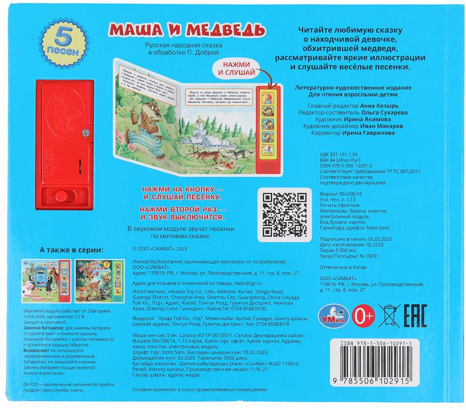 💳 Оплатить за товар можно при получении 🇰🇿 Есть бесплатная доставка по Казахстану от 1 дня 🎁 Копите бонусы с каждой покупки Серия: 5 кнопок Музыкальная книга «Маша и медведь» ТМ «УМка» станет отличным подарком для маленького любознайки. Малыш с удовольствием будет листать плотные страницы, рассматривать яркие картинки и погружаться в удивительный сказочный мир, а также нажимать на звуковые кнопки и слушать мелодичные песенки. Ребёнок легко освоит включение звука: по нажатию на кнопку песенка включится, при втором нажатии выключится и т.д. Благодаря компактному размеру книгу удобно взять с собой в дорогу. |