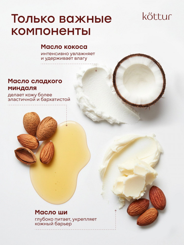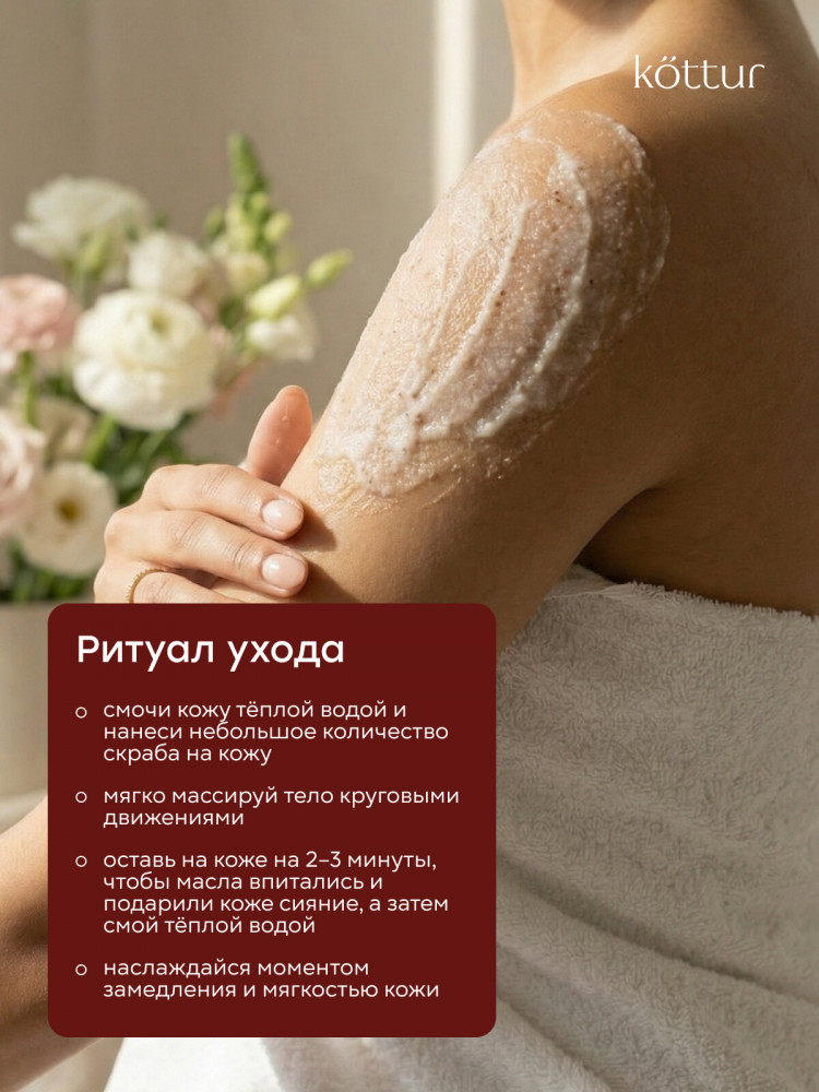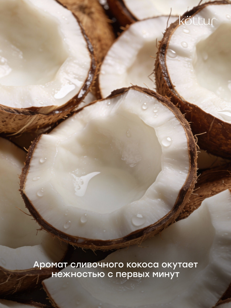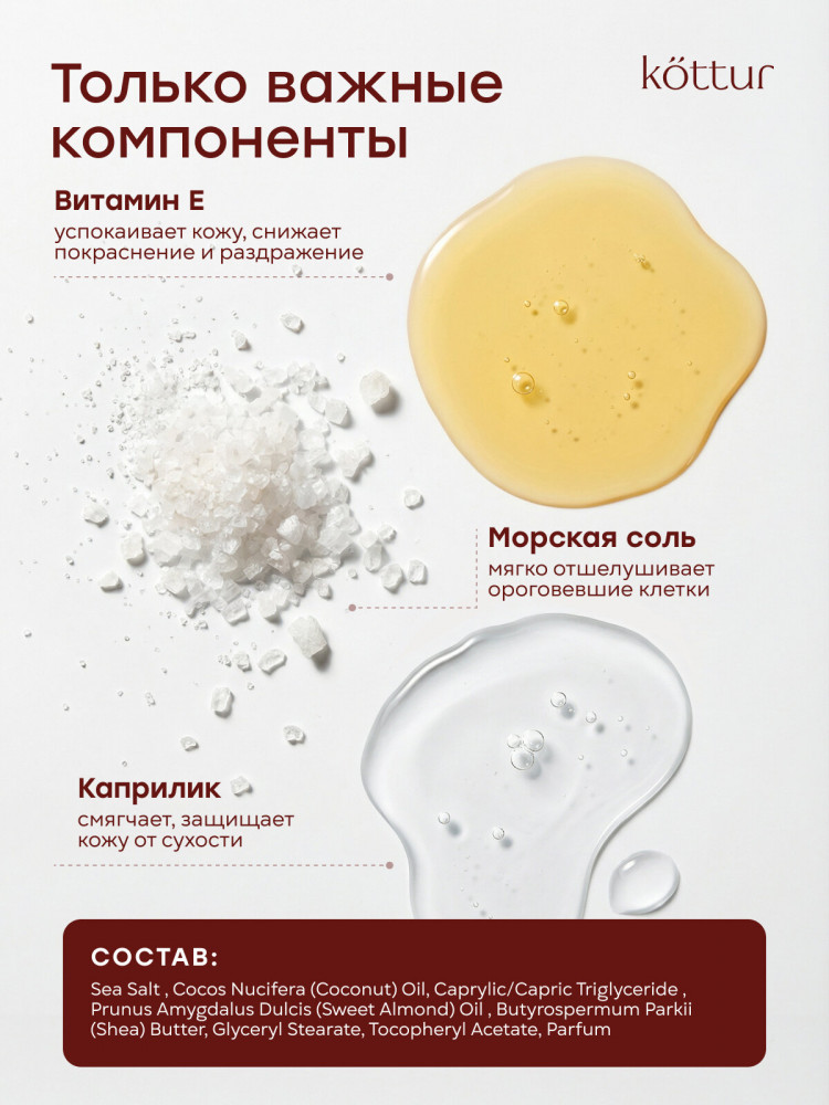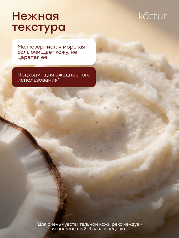 Скраб для тела Kottur с ароматом кокоса — эффективный солевой скраб для тела на основе морской соли и натуральных масел, созданный для мягкого очищения, обновления и ухода за кожей. Скраб для тела удаляет омертвевшие клетки кожи, очищает и выравнивает рельеф, делая кожу гладкой, мягкой и сияющей уже после первого применения. Солевой скраб для тела с морской солью обеспечивает безопасное и эффективное скрабирование, стимулирует обновление клеток, улучшает кровообращение и лимфоток, помогает уменьшить отечность и ощущение тяжести. Благодаря массажному эффекту средство подходит как скраб для тела антицеллюлитный и для ухода за проблемными зонами: бедрами, ягодицами и животом.