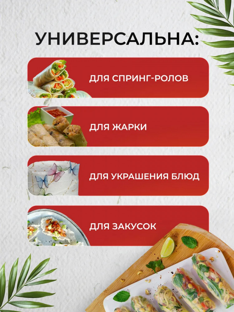 💳 Оплатить за товар можно при получении 🇰🇿 Есть бесплатная доставка по Казахстану от 1 дня 🎁 Копите бонусы с каждой покупки Серия: Misaki Рисовая бумага — это натуральный и универсальный ингредиент азиатской кухни, идеально подходящий для приготовления спринг-роллов, овощных и морепродуктовых рулетов, а также легких закусок. При кратковременном замачивании в тёплой воде она становится тонкой и гибкой, что облегчает работу с ней. Для подготовки листа достаточно несколько секунд удерживать его в воде, после чего можно выкладывать начинку и формировать блюдо. |