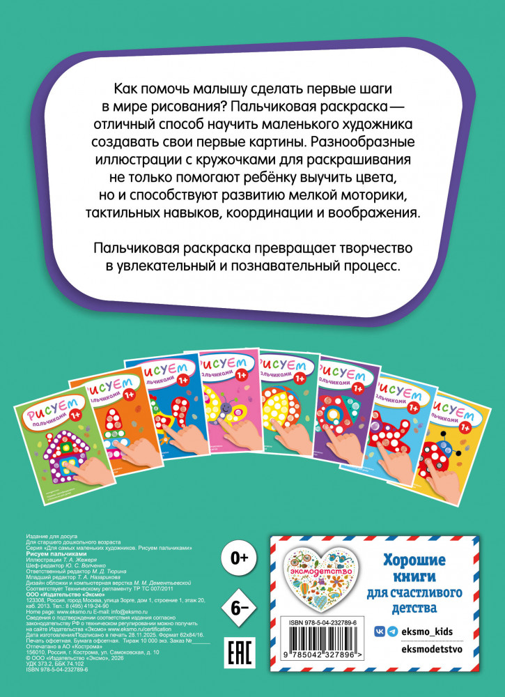 💳 Оплатить за товар можно при получении 🇰🇿 Есть бесплатная доставка по Казахстану от 1 дня 🎁 Копите бонусы с каждой покупки Серия: Для самых маленьких художников. Рисуем пальчиками Пальчиковая раскраска — идеальная разукрашка для малыша, который только делает первые шаги в мире рисования. Яркие и крупные иллюстрации просты и удобны для раскрашивания, а разные по размеру кружки предназначены для того, чтобы ребенок мог рисовать всеми пальчиками. Пальчиковая раскраска развивает мелкую моторику, координацию движений, ощущение цвета и воображение малыша. Кроме того, каждая иллюстрация в раскраске подписана крупными буквами, которые тоже можно раскрасить, что также способствует развитию ребенка. Раскраска подходит как мальчикам, так и девочкам, а благодаря удобному небольшому формату ее можно брать с собой в поездку. |