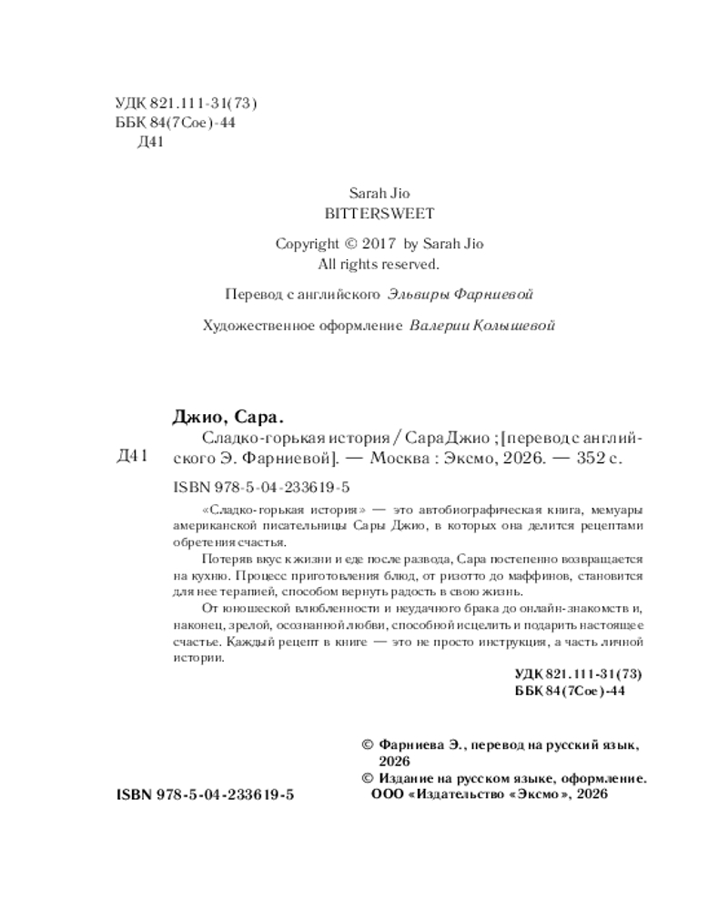 💳 Оплатить за товар можно при получении 🇰🇿 Есть бесплатная доставка по Казахстану от 1 дня 🎁 Копите бонусы с каждой покупки Серия: Драгоценная коллекция историй «Сладко-горькая история» — это автобиографическая книга, мемуары американской писательницы Сары Джио, в которых она делится рецептами обретения счастья. Потеряв вкус к жизни и еде после развода, Сара постепенно возвращается на кухню. Процесс приготовления блюд, от ризотто до маффинов, становится для нее терапией, способом вернуть радость в свою жизнь. От юношеской влюбленности и неудачного брака до онлайн-знакомств и, наконец, зрелой, осознанной любви, способной исцелить и подарить настоящее счастье. Каждый рецепт в книге — это не просто инструкция, а часть личной истории. |
