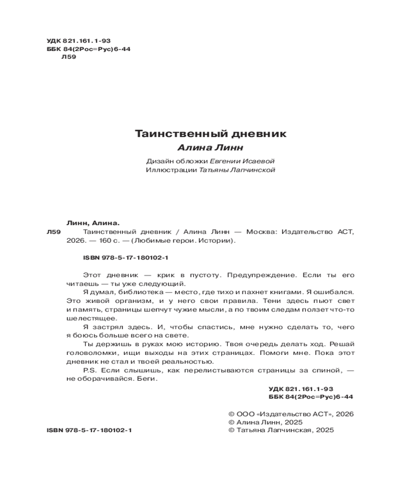 💳 Оплатить за товар можно при получении 🇰🇿 Есть бесплатная доставка по Казахстану от 1 дня 🎁 Копите бонусы с каждой покупки Серия: Любимые герои. Истории Этот дневник — крик в пустоту. Предупреждение. Если ты его читаешь — ты уже следующий. |