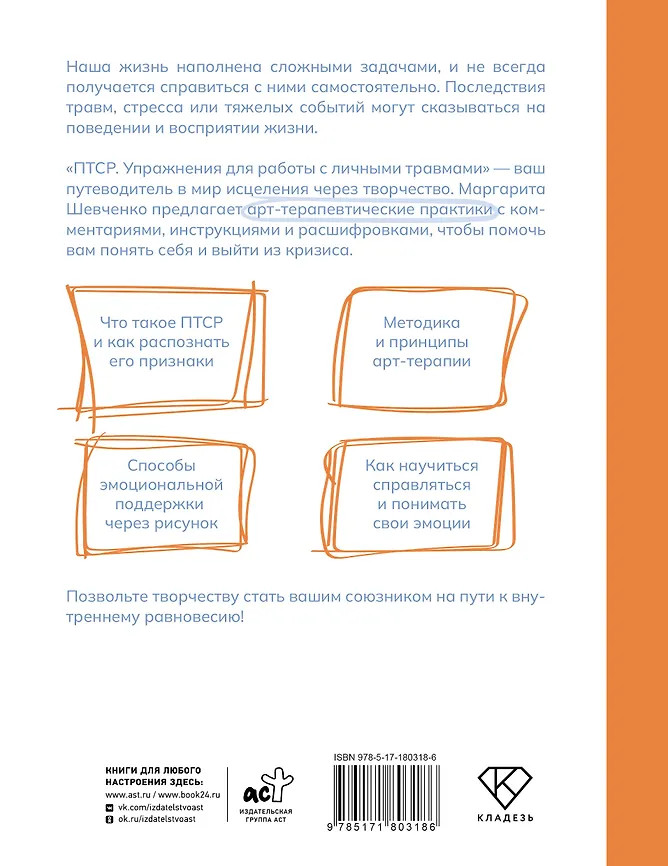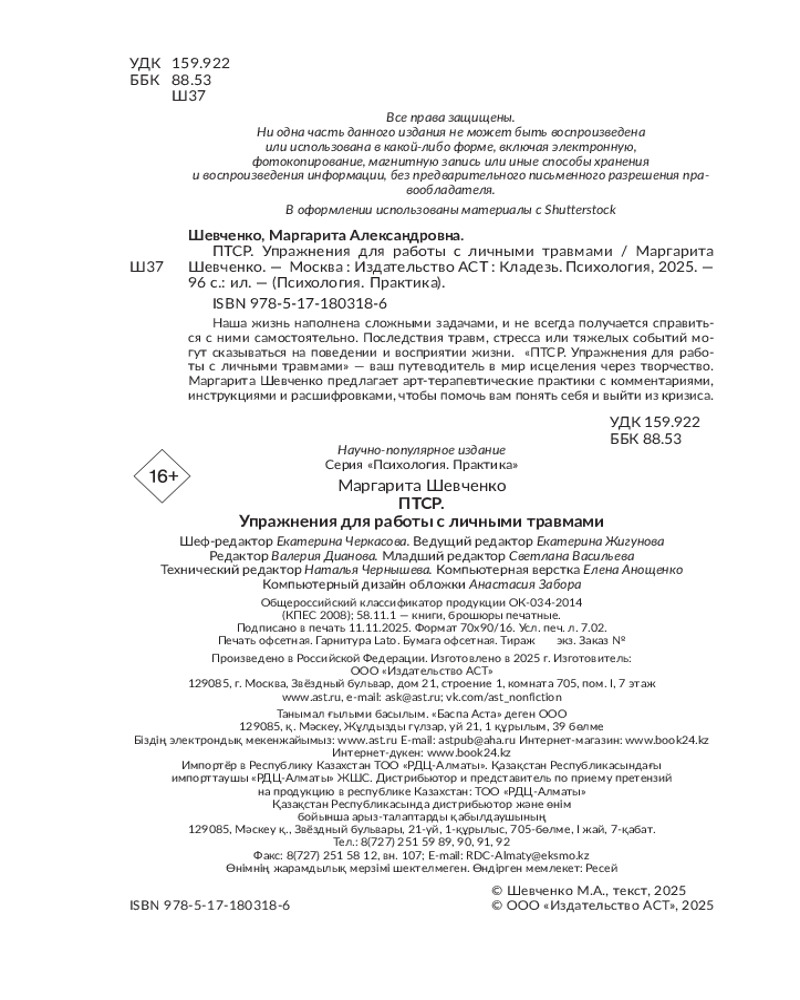 💳 Оплатить за товар можно при получении 🇰🇿 Есть бесплатная доставка по Казахстану от 1 дня 🎁 Копите бонусы с каждой покупки Серия: Психология. Практика Наша жизнь наполнена сложными задачами, и не всегда получается справиться с ними самостоятельно. Последствия травм, стресса или тяжелых событий могут сказываться на поведении и восприятии жизни. «ПТСР. Упражнения для работы с личными травмами» — ваш путеводитель в мир исцеления через творчество. Маргарита Шевченко предлагает арт-терапевтические практики с комментариями, инструкциями и расшифровками, чтобы помочь вам понять себя и выйти из кризиса. Позвольте творчеству стать вашим союзником на пути к внутреннему равновесию! |