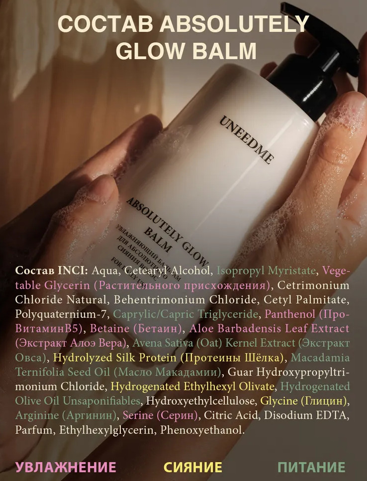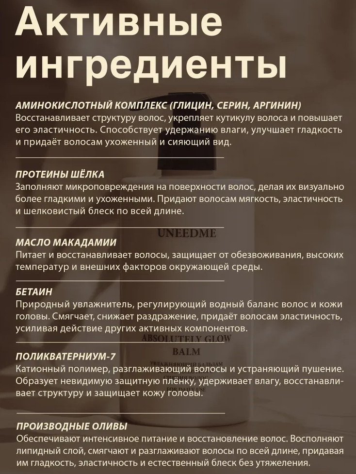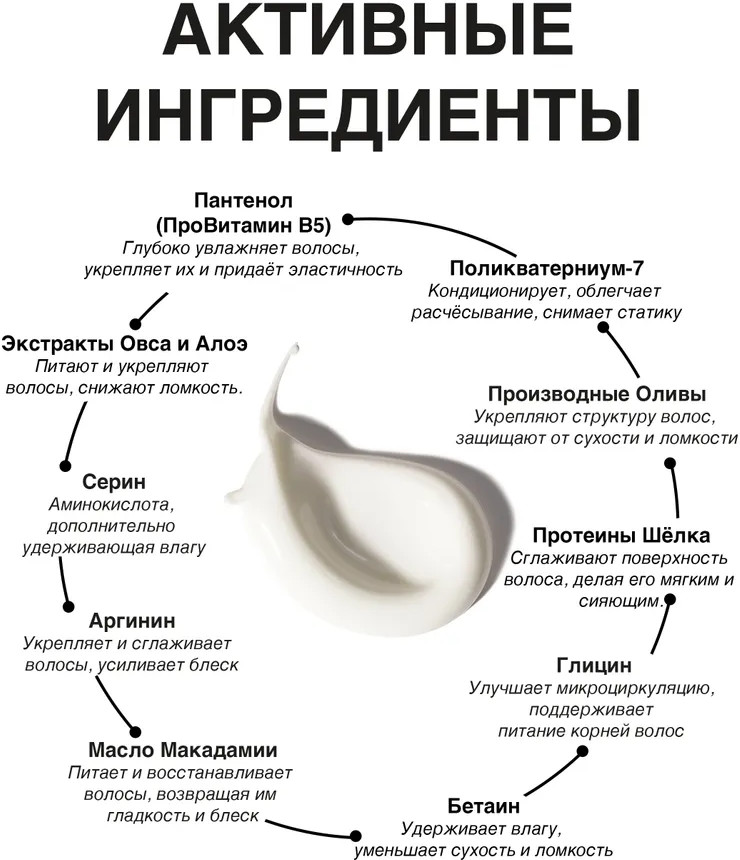 Бальзам: Aqua/Water, Cetearyl Alcohol, Isopropyl Myristate, Vegetable Glycerin (Растительного присхождения), Cetrimonium Chloride Natural, Behentrimonium Chloride, Cetyl Palmitate, Polyquaternium-7, Caprylic/Capric Triglyceride, Panthenol (Про-ВитаминВ5), Betaine (Бетаин), Aloe Barbadensis Leaf Extract (Экстракт Алоэ Вера), Avena Sativa (Oat) Kernel Extract (ЭкстрактОвса), Hydrolyzed Silk Protein (Протеины Шёлка), Macadamia Ternifolia Seed Oil (Масло Макадамии), Guar Hydroxypropyltrimonium Chloride, Hydrogenated Ethylhexyl Olivate, Hydrogenated Olive Oil Unsaponifiables, Hydroxyethylcellulose, Glycine (Глицин), Arginine (Аргинин), Serine (Серин), Citric Acid, Disodium EDTA, Parfum, Ethylhexylglycerin, Phenoxyethanol.