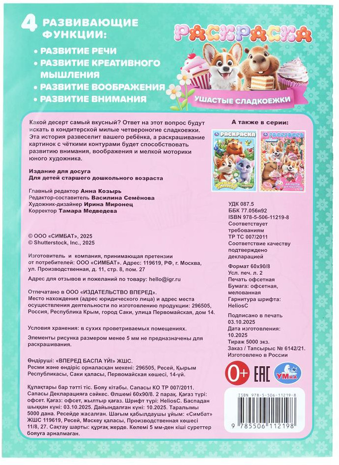 💳 Оплатить за товар можно при получении 🇰🇿 Есть бесплатная доставка по Казахстану от 1 дня 🎁 Копите бонусы с каждой покупки Раскраска «Ушастые сладкоежки» ТМ «УМка» — отличный подарок для юных художников. Эта увлекательная раскраска про забавных сладкоежек — корги и капибар — понравится вашему ребёнку. В ней он найдёт интересные картинки с чёткими контурами и сюжетными текстами к ним. Данное издание станет отличным вариантом, чтобы взять его с собой в путешествие и скоротать время в дороге за раскрашиванием. |