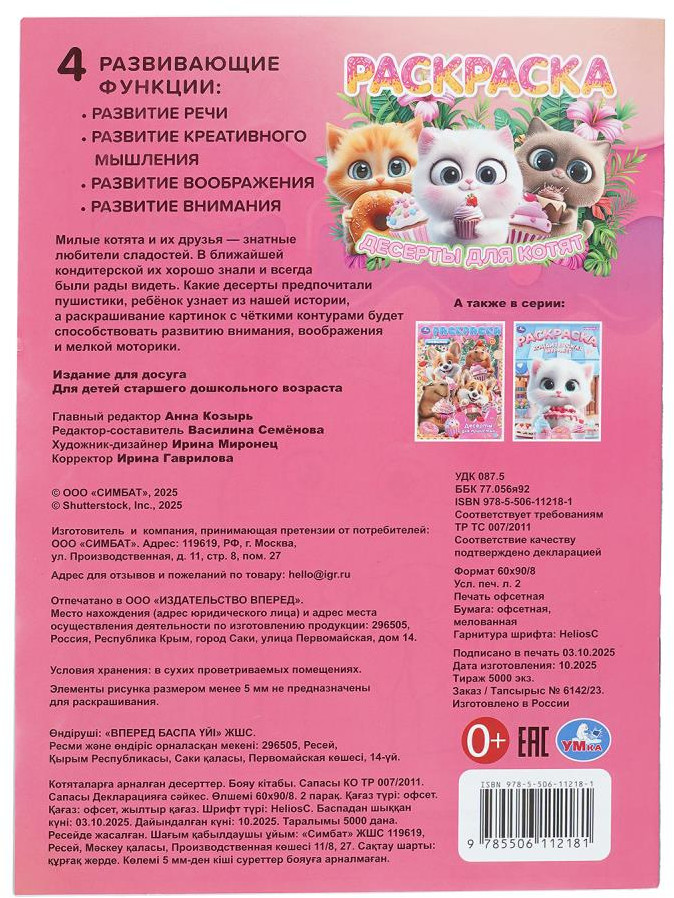 💳 Оплатить за товар можно при получении 🇰🇿 Есть бесплатная доставка по Казахстану от 1 дня 🎁 Копите бонусы с каждой покупки Раскраска «Десерты для котят» ТМ «УМка» — отличный подарок для юных художников. Эта увлекательная раскраска про очаровательных пушистиков непременно понравится вашему ребёнку. В ней он найдёт интересные картинки с чёткими контурами и сюжетными текстами к ним. Данное издание станет отличным вариантом, чтобы взять его с собой в путешествие и скоротать время в дороге за раскрашиванием. |