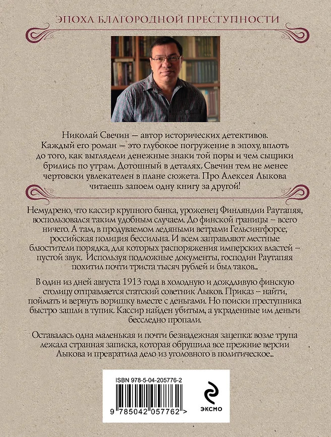 Немудрено, что кассир крупного банка, уроженец Финляндии Раутапяя, воспользовался таким удобным случаем. До финской границы — всего ничего. А там, в продуваемом ледяными ветрами Гельсингфорсе, российская полиция бессильна. И всем заправляют местные блюстители порядка, для которых распоряжения имперских властей — пустой звук. Используя подложные документы, господин Раутапяя похитил почти триста тысяч рублей и был таков... В один из дней августа 1913 года в холодную и дождливую финскую столицу отправляется статский советник Лыков. Приказ — найти, поймать и вернуть воришку вместе с деньгами. Но поиски преступника быстро зашли в тупик. Кассир найден убитым, а украденные им деньги бесследно пропали. Оставалась одна маленькая и почти безнадежная зацепка: возле трупа лежала странная записка, которая обрушила все прежние версии Лыкова и превратила дело из уголовного в политическое... Захватывающий исторический детектив от победителя премии «Русский детектив» Николая Свечина. Роман входит в цикл произведений о сыщике Алексее Лыкове и является 35-м по счету. |
