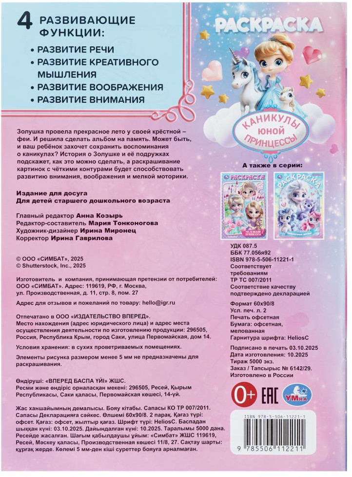💳 Оплатить за товар можно при получении 🇰🇿 Есть бесплатная доставка по Казахстану от 1 дня 🎁 Копите бонусы с каждой покупки Раскраска «Каникулы юной принцессы» ТМ «УМка» обязательно понравится юным художницам. Эта занимательная раскраска про приключения очаровательной принцессы в стране, где обитают волшебные существа, не только скрасит досуг ребёнка, но и поможет потренировать руку к письму. Внутри детей ожидают интересные картинки с чётким контуром и сюжетные тексты к ним. Благодаря удобному формату раскраску можно взять с собой в дорогу. |