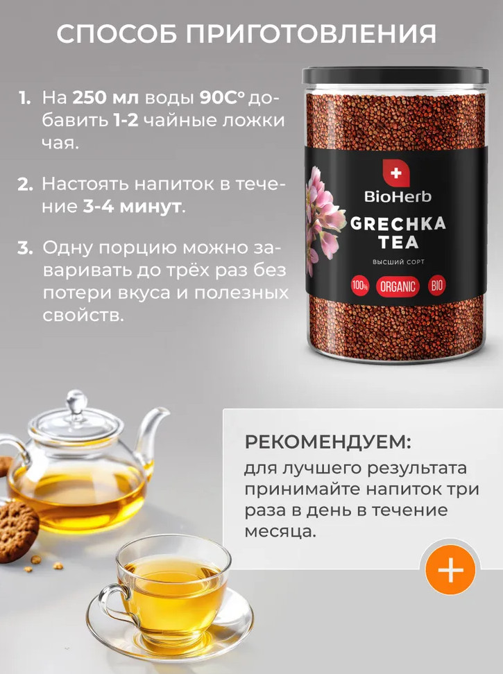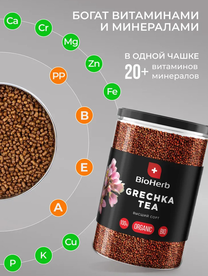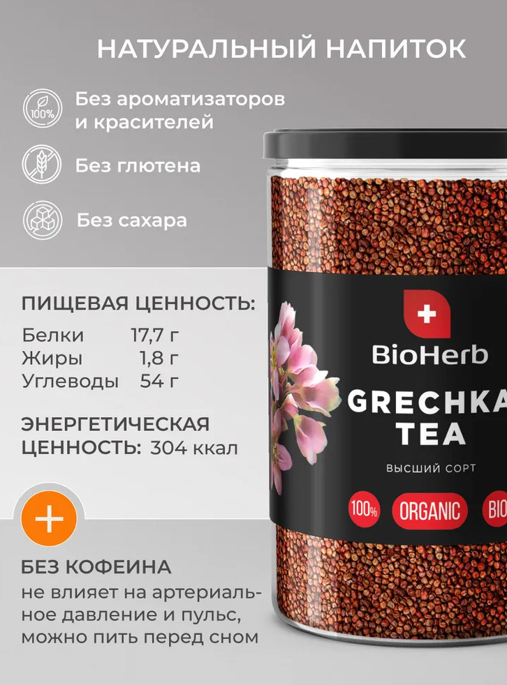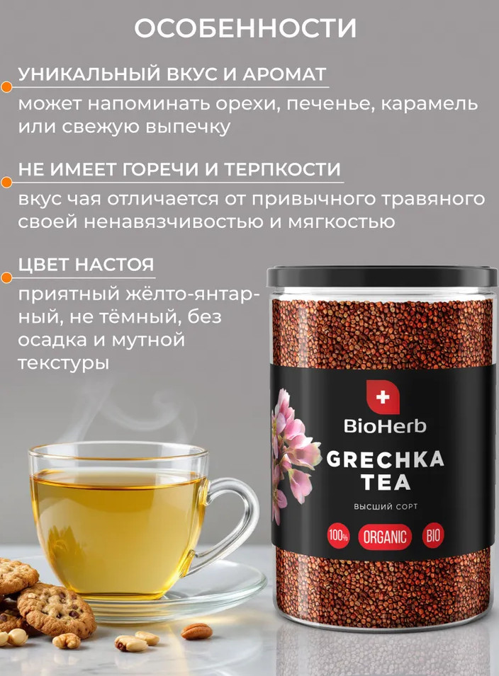 Гречишный чай в банке BioHerb — идеальный выбор для тех, кто хочет заботиться о своем самочувствие и организме. 100% натуральный состав без искусственных добавок, ароматизаторов и красителей. Продукт изготовлен из обжаренных семян гречихи, поэтому обладает мягким, приятным вкусом, напоминающим овсяное печенье с нотками миндаля и карамели. Он станет отличным вариантом как для утреннего, так и для вечернего чаепития. Богат антиоксидантами, которые помогают укрепить иммунитет и защитить клетки от вредного воздействия свободных радикалов.