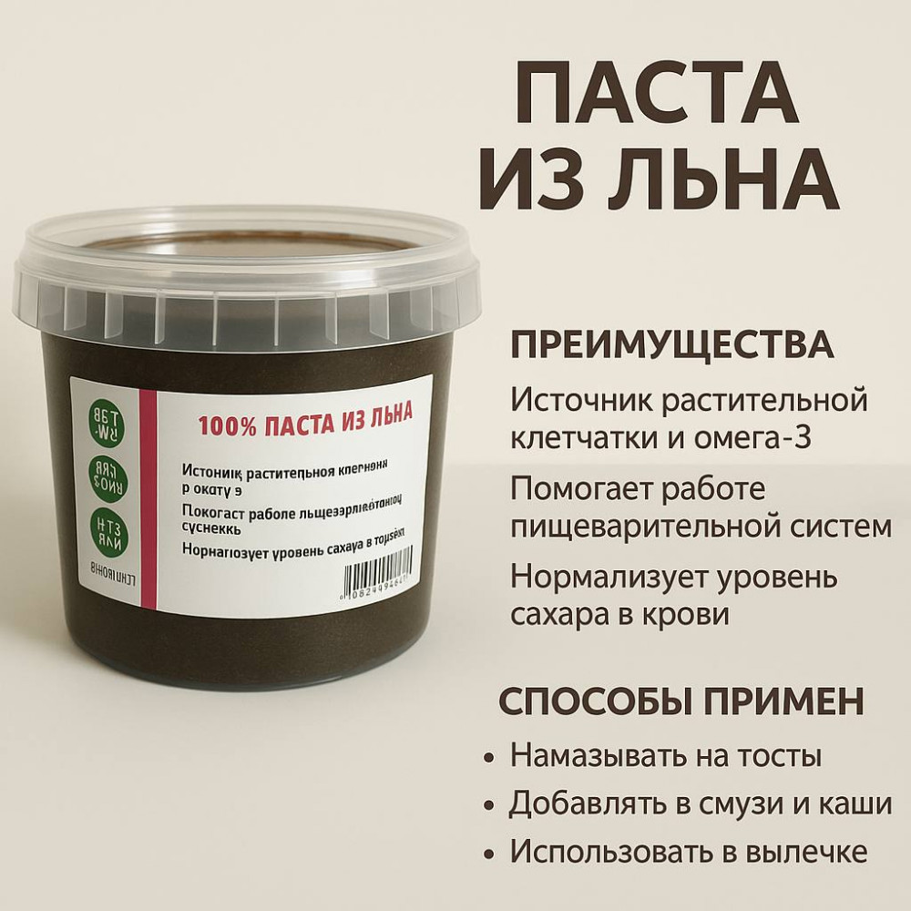 100% паста из льна — суперфуд для вашего здоровья! Натуральная паста из тёмного льна — это богатый источник Омега-3, клетчатки и антиоксидантов. Подходит для всех, кто придерживается здорового питания (ЗОЖ), безглютеновой диеты, страдает диабетом или просто ищет вкусную и полезную альтернативу сладким намазкам.