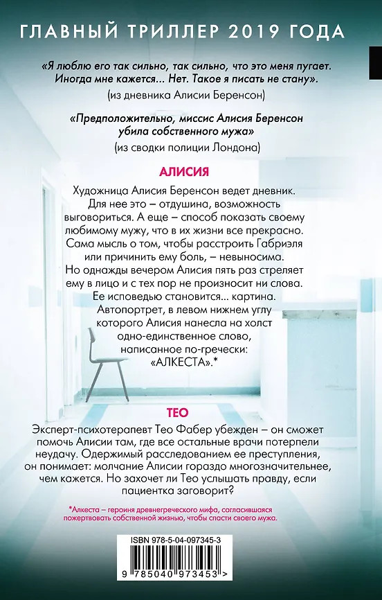 Жизнь Алисии Беренсон кажется идеальной. Известная художница вышла замуж за востребованного модного фотографа. Она живет в одном из самых привлекательных и дорогих районов Лондона в роскошном доме с большими окнами, выходящими в парк. Однажды поздним вечером, когда ее муж Габриэль возвращается домой с очередной съемки, Алисия пять раз стреляет ему в лицо. И с тех пор не произносит ни слова. Отказ Алисии говорить или давать какие-либо объяснения будоражит общественное воображение. Тайна делает художницу знаменитой. И в то время как сама она находится на принудительном лечении, цена ее последней работы — автопортрета с единственной надписью по-гречески «АЛКЕСТА» — стремительно растет.