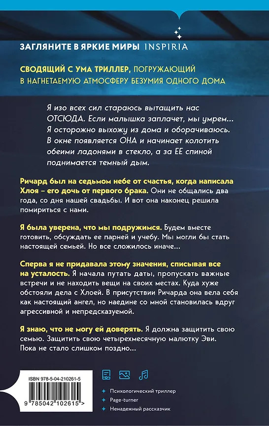 Сперва я не предавала этому значения, списывая все на усталость. Я начала путать даты, пропускать важные встречи и не находить вещи на своих местах. Куда хуже обстояли дела с Хлоей. В присутствии Ричарда она вела себя как настоящий ангел, но наедине со мной становилась вдруг агрессивной и непредсказуемой. Я знаю, что не могу ей доверять. Я должна защитить свою семью. Защитить свою четырехмесячную малютку Эви. Пока не стало слишком поздно...