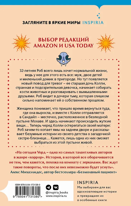 Женщина понимает, что пришло время вернуться туда, где она выросла, и вместе с Колли отправляется в Сандайл — местечко, расположенное в безлюдной пустыне Мохаве. И здесь начинают происходить жуткие вещи... Теперь черед Колли остерегаться своей матери: Роб зачем-то копает ямы на заднем дворе и рассказывает безумные истории из своего детства о загадочной сестре-близнеце... Кажется, лишь одна из них сможет выбраться из этой пустыни живой. |
