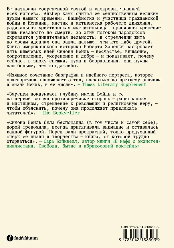 Ее называли современной святой и «покровительницей всех изгоев». Альбер Камю считал ее «единственным великим духом нашего времени». Пацифистка и участница гражданской войны в Испании, мистик и активистка рабочего движения, радикальная христианская мыслительница, принявшая крещение лишь незадолго до смерти. За этим потоком парадоксов скрывается удивительная цельность: в стремлении жить по своим идеалам она зашла дальше, чем кто-либо другой. Книга американского историка Роберта Зарецки раскрывает пять ключевых идей Симоны Вейль — несчастье, внимание, сопротивление, укоренение и добро — и показывает, почему сейчас, в эпоху спешки, шума и безразличия, они нужны нам больше, чем когда-либо. |