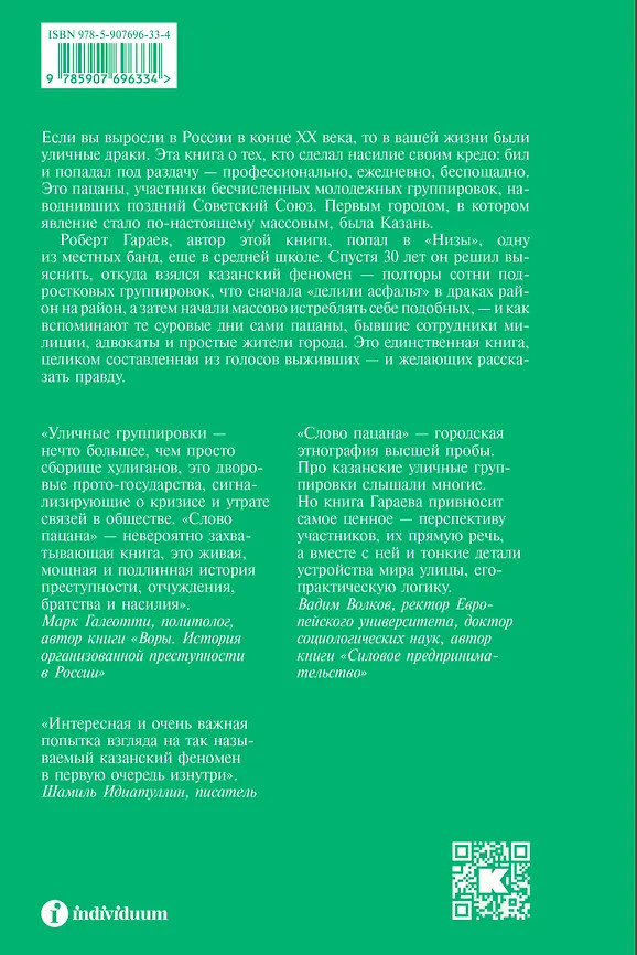 Если вы выросли в России в конце XX века, то в вашей жизни были уличные драки. Эта книга о тех, кто сделал насилие своим кредо: бил и попадал под раздачу — профессионально, ежедневно, беспощадно. Это пацаны, участники бесчисленных молодежных группировок, наводнивших поздний Советский Союз. Первым городом, в котором явление стало по-настоящему массовым, была Казань. Роберт Гараев, автор этой книги, попал в «Низы», одну из местных банд, еще в средней школе. Спустя 30 лет он решил выяснить, откуда взялся казанский феномен — полторы сотни подростковых группировок, что сначала «делили асфальт» в драках район на район, а затем начали массово истреблять себе подобных, — и как вспоминают те суровые дни сами пацаны, бывшие сотрудники милиции, адвокаты и простые жители города, обезображенного страхом и жестокостью. Это единственная книга, целиком составленная из голосов выживших — и желающих рассказать правду. |