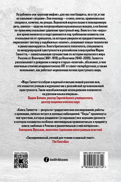 За рубежом они «русская мафия», для нас они бандиты, но и тут, и там их называют «ворами». Они повсюду — в кино, книгах, криминальных сводках и, конечно, на улицах. Воровской жаргон вошел в повседневную речь, шансон — один из популярнейших музыкальных жанров, а на бизнес по-прежнему оказывает давление преступный мир. Вместе с тем «воры» всё время меняются и подстраиваются под требования момента: они отказываются от принципов, за которые умирали их предшественники, перенимают тактику у зарубежных «коллег», осваивают новые технологии и умело маскируются. Книга британского политолога, специалиста по международной преступности и российским спецслужбам Марка Галеотти — захватывающее путешествие по истории воровского мира России: от Япончика (1891–1919) до Япончика (1940—2009).