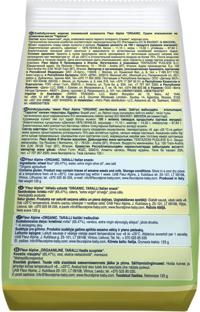 💳 Оплатить за товар можно при получении 🇰🇿 Есть бесплатная доставка по Казахстану от 1 дня 🎁 Копите бонусы с каждой покупки Сушки итальянские ТАРАЛЛИ Fleur Alpine на оливковом масле первого холодного отжима имеют короткий и простой состав: мука пшеничная, вода, оливковое масло первого холодного отжима, морская соль. Органический продукт, произведен и сертифицирован в соответствии с Регламентами Европейского Союза № 834/2007 и № 889/2008 об органическом сельском хозяйстве. Сушки ТАРАЛЛИ Fleur Alpine производятся на юге Италии в регионе Апулия. |