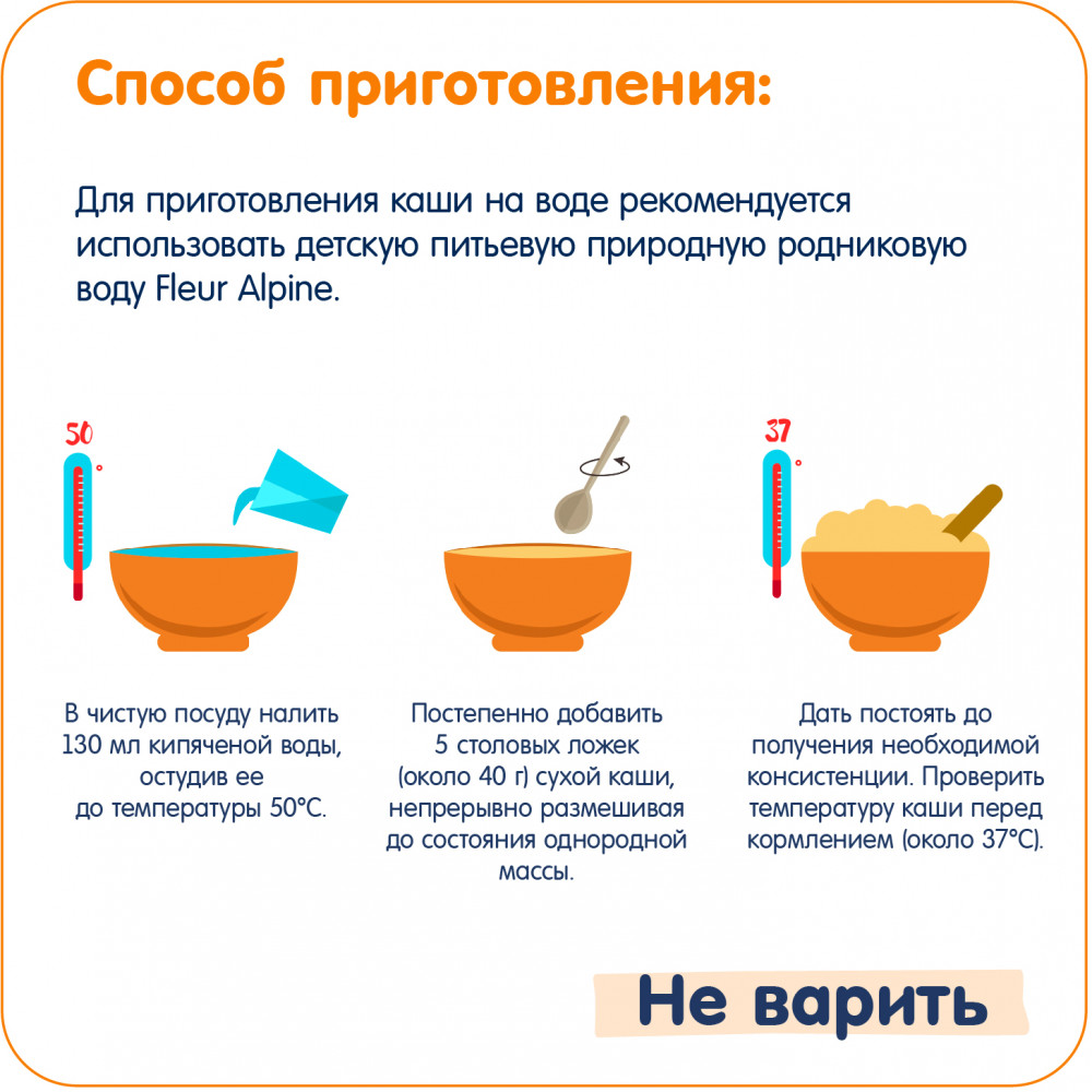 Способ приготовления: в чистую посуду налить 130 мл кипяченой воды, остудив ее до температуры 50°С. Постепенно добавить 5 столовых ложек (около 40 г) сухой каши, непрерывно размешивая до состояния однородной массы. Дать постоять до получения необходимой консистенции. Проверить температуру каши перед кормлением (около 37°С).