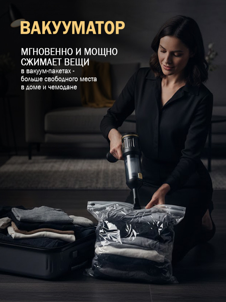 Портативный пылесос 4 в 1 STL — универсальный компактный прибор для быстрой и качественной уборки в автомобиле, доме и в поездках. Устройство сочетает в себе функции мощного ручного пылесоса для салона и мебели, мини-системы для труднодоступных мест, вакууматора для упаковки одежды и насоса для надувания матрасов, кругов и шаров. Мощное всасывание позволяет удалять пыль, крошки, шерсть и мелкий мусор, а ёмкий аккумулятор обеспечивает продолжительную работу без подключения к сети, что делает пылесос удобным в дороге и на отдыхе.