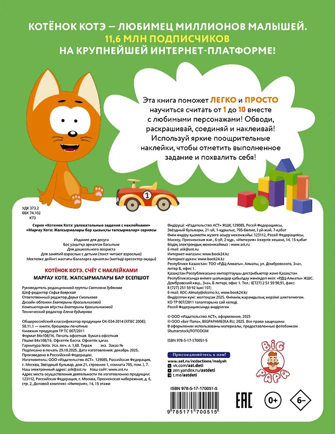 💳 Оплатить за товар можно при получении 🇰🇿 Есть бесплатная доставка по Казахстану от 1 дня 🎁 Копите бонусы с каждой покупки Серия: Котенок Котэ: увлекательные задания с наклейками Котёнок Котэ — любимец миллионов малышей. 11,6 млн подписчиков на крупнейшей интернет-платформе! Эта книга поможет ЛЕГКО и ПРОСТО научиться считать от 1 до 10 вместе с любимыми персонажами! Обводи, раскрашивай, соединяй и наклеивай! Используй яркие поощрительные наклейки, чтобы отметить выполненное задание и похвалить себя! |